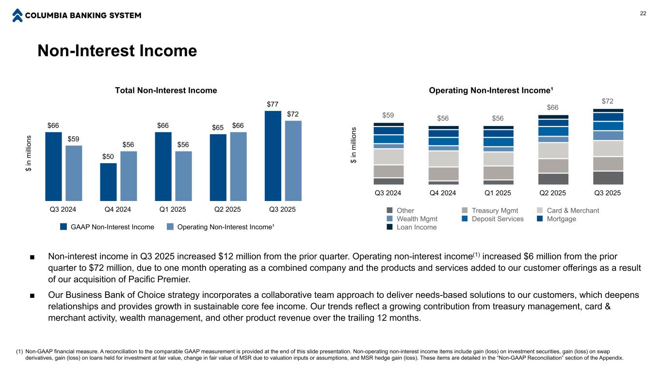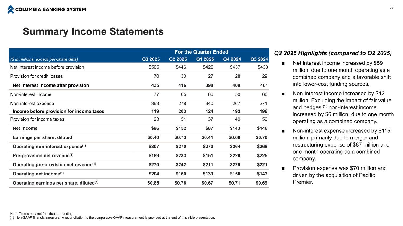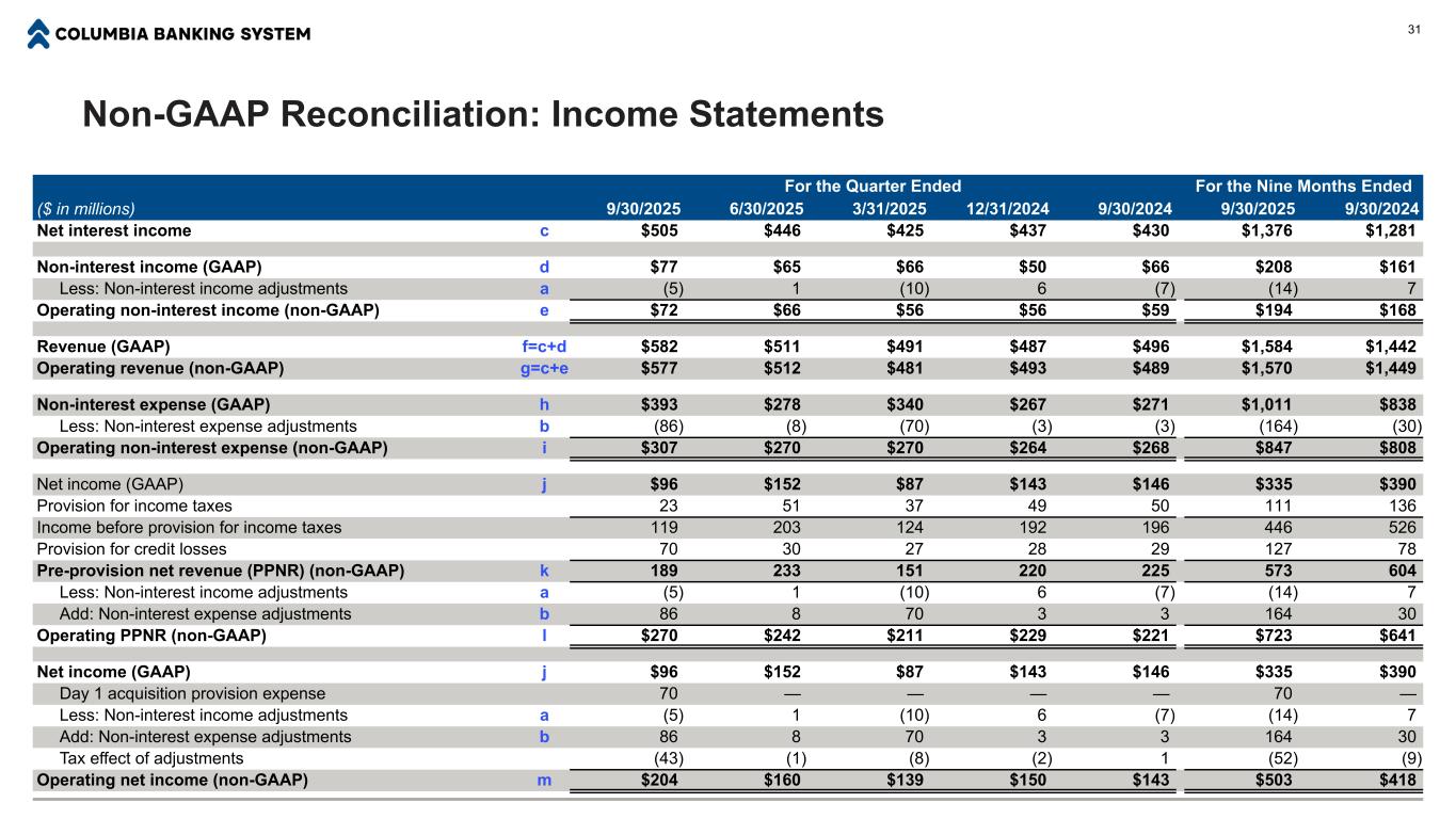 Non-GAAP Reconciliation: Income Statements For the Quarter Ended For the Nine Months Ended ($ in millions) 9/30/2025 6/30/2025 3/31/2025 12/31/2024 9/30/2024 9/30/2025 9/30/2024 Net interest income c $505 $446 $425 $437 $430 $1,376 $1,281 Non-interest income (GAAP) d $77 $65 $66 $50 $66 $208 $161 Less: Non-interest income adjustments a (5) 1 (10) 6 (7) (14) 7 Operating non-interest income (non-GAAP) e $72 $66 $56 $56 $59 $194 $168 Revenue (GAAP) f=c+d $582 $511 $491 $487 $496 $1,584 $1,442 Operating revenue (non-GAAP) g=c+e $577 $512 $481 $493 $489 $1,570 $1,449 Non-interest expense (GAAP) h $393 $278 $340 $267 $271 $1,011 $838 Less: Non-interest expense adjustments b (86) (8) (70) (3) (3) (164) (30) Operating non-interest expense (non-GAAP) i $307 $270 $270 $264 $268 $847 $808 Net income (GAAP) j $96 $152 $87 $143 $146 $335 $390 Provision for income taxes 23 51 37 49 50 111 136 Income before provision for income taxes 119 203 124 192 196 446 526 Provision for credit losses 70 30 27 28 29 127 78 Pre-provision net revenue (PPNR) (non-GAAP) k 189 233 151 220 225 573 604 Less: Non-interest income adjustments a (5) 1 (10) 6 (7) (14) 7 Add: Non-interest expense adjustments b 86 8 70 3 3 164 30 Operating PPNR (non-GAAP) l $270 $242 $211 $229 $221 $723 $641 Net income (GAAP) j $96 $152 $87 $143 $146 $335 $390 Day 1 acquisition provision expense 70 — — — — 70 — Less: Non-interest income adjustments a (5) 1 (10) 6 (7) (14) 7 Add: Non-interest expense adjustments b 86 8 70 3 3 164 30 Tax effect of adjustments (43) (1) (8) (2) 1 (52) (9) Operating net income (non-GAAP) m $204 $160 $139 $150 $143 $503 $418 31