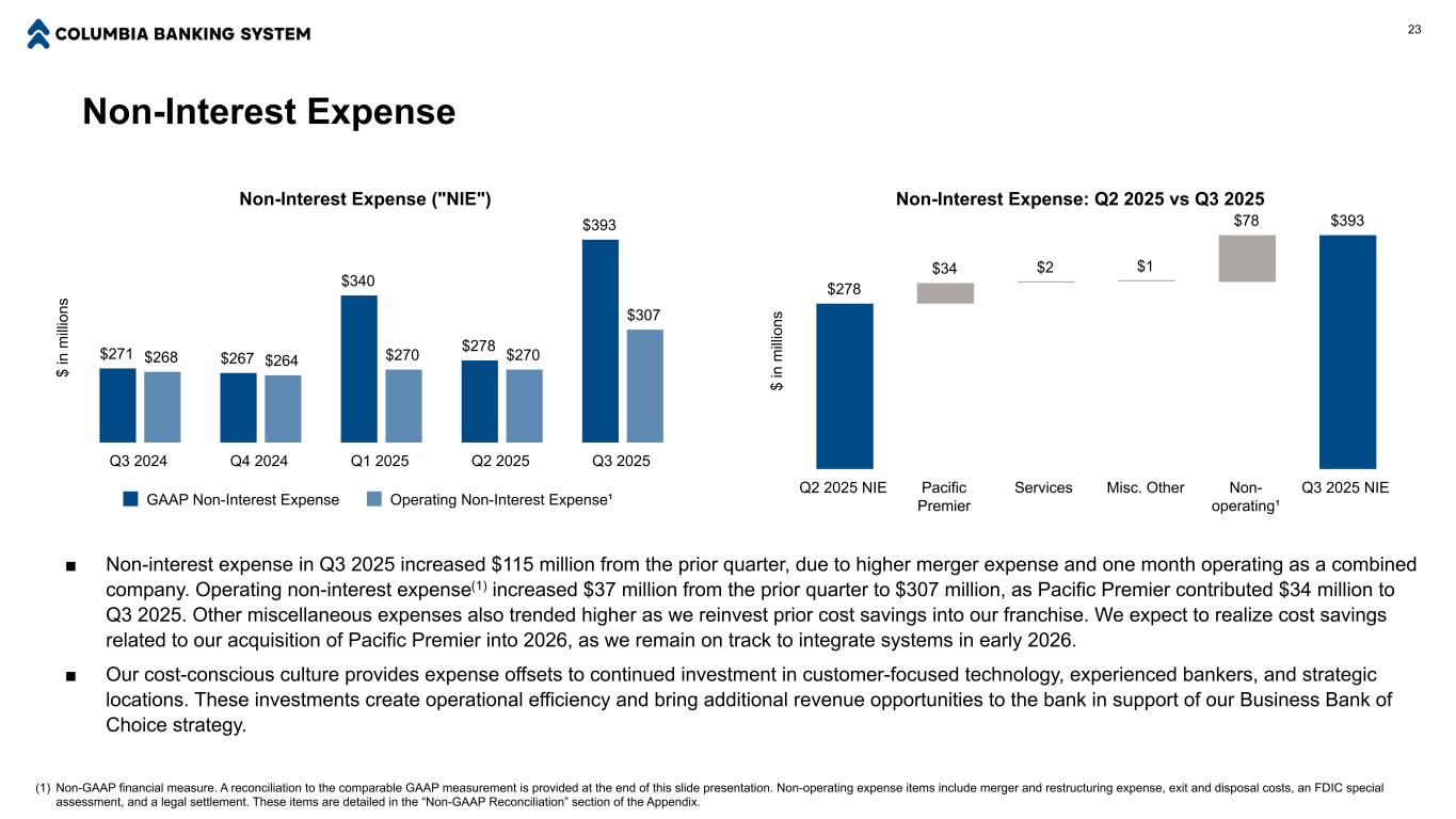 Non-Interest Income 22 $ in m ill io ns Total Non-Interest Income $66 $50 $66 $65 $77 $59 $56 $56 $66 $72 GAAP Non-Interest Income Operating Non-Interest Income¹ Q3 2024 Q4 2024 Q1 2025 Q2 2025 Q3 2025 ■ Non-interest income in Q3 2025 increased $12 million from the prior quarter. Operating non-interest income(1) increased $6 million from the prior quarter to $72 million, due to one month operating as a combined company and the products and services added to our customer offerings as a result of our acquisition of Pacific Premier. ■ Our Business Bank of Choice strategy incorporates a collaborative team approach to deliver needs-based solutions to our customers, which deepens relationships and provides growth in sustainable core fee income. Our trends reflect a growing contribution from treasury management, card & merchant activity, wealth management, and other product revenue over the trailing 12 months. $ in m ill io ns Operating Non-Interest Income¹ $59 $56 $56 $66 $72 Other Treasury Mgmt Card & Merchant Wealth Mgmt Deposit Services Mortgage Loan Income Q3 2024 Q4 2024 Q1 2025 Q2 2025 Q3 2025 (1) Non-GAAP financial measure. A reconciliation to the comparable GAAP measurement is provided at the end of this slide presentation. Non-operating non-interest income items include gain (loss) on investment securities, gain (loss) on swap derivatives, gain (loss) on loans held for investment at fair value, change in fair value of MSR due to valuation inputs or assumptions, and MSR hedge gain (loss). These items are detailed in the “Non-GAAP Reconciliation” section of the Appendix.