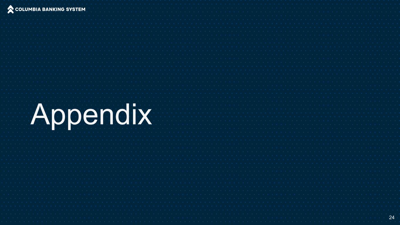 Non-Interest Expense 23 $ in m ill io ns Non-Interest Expense ("NIE") $271 $267 $340 $278 $393 $268 $264 $270 $270 $307 GAAP Non-Interest Expense Operating Non-Interest Expense¹ Q3 2024 Q4 2024 Q1 2025 Q2 2025 Q3 2025 ■ Non-interest expense in Q3 2025 increased $115 million from the prior quarter, due to higher merger expense and one month operating as a combined company. Operating non-interest expense(1) increased $37 million from the prior quarter to $307 million, as Pacific Premier contributed $34 million to Q3 2025. Other miscellaneous expenses also trended higher as we reinvest prior cost savings into our franchise. We expect to realize cost savings related to our acquisition of Pacific Premier into 2026, as we remain on track to integrate systems in early 2026. ■ Our cost-conscious culture provides expense offsets to continued investment in customer-focused technology, experienced bankers, and strategic locations. These investments create operational efficiency and bring additional revenue opportunities to the bank in support of our Business Bank of Choice strategy. $ in m ill io ns Non-Interest Expense: Q2 2025 vs Q3 2025 $278 $34 $2 $1 $78 $393 Q2 2025 NIE Pacific Premier Services Misc. Other Non- operating¹ Q3 2025 NIE (1) Non-GAAP financial measure. A reconciliation to the comparable GAAP measurement is provided at the end of this slide presentation. Non-operating expense items include merger and restructuring expense, exit and disposal costs, an FDIC special assessment, and a legal settlement. These items are detailed in the “Non-GAAP Reconciliation” section of the Appendix.