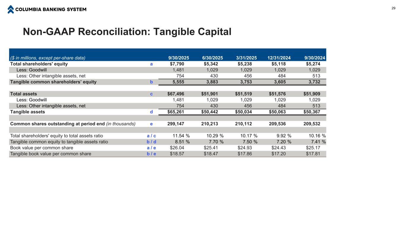 Non-GAAP Reconciliation: Tangible Capital ($ in millions, except per-share data) 9/30/2025 6/30/2025 3/31/2025 12/31/2024 9/30/2024 Total shareholders' equity a $7,790 $5,342 $5,238 $5,118 $5,274 Less: Goodwill 1,481 1,029 1,029 1,029 1,029 Less: Other intangible assets, net 754 430 456 484 513 Tangible common shareholders’ equity b 5,555 3,883 3,753 3,605 3,732 Total assets c $67,496 $51,901 $51,519 $51,576 $51,909 Less: Goodwill 1,481 1,029 1,029 1,029 1,029 Less: Other intangible assets, net 754 430 456 484 513 Tangible assets d $65,261 $50,442 $50,034 $50,063 $50,367 Common shares outstanding at period end (in thousands) e 299,147 210,213 210,112 209,536 209,532 Total shareholders' equity to total assets ratio a / c 11.54 % 10.29 % 10.17 % 9.92 % 10.16 % Tangible common equity to tangible assets ratio b / d 8.51 % 7.70 % 7.50 % 7.20 % 7.41 % Book value per common share a / e $26.04 $25.41 $24.93 $24.43 $25.17 Tangible book value per common share b / e $18.57 $18.47 $17.86 $17.20 $17.81 29