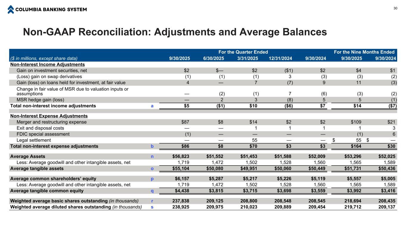 Non-GAAP Reconciliation: Adjustments and Average Balances For the Quarter Ended For the Nine Months Ended ($ in millions, except share data) 9/30/2025 6/30/2025 3/31/2025 12/31/2024 9/30/2024 9/30/2025 9/30/2024 Non-Interest Income Adjustments Gain on investment securities, net $2 $— $2 ($1) $2 $4 $1 (Loss) gain on swap derivatives (1) (1) (1) 3 (3) (3) (2) Gain (loss) on loans held for investment, at fair value 4 — 7 (7) 9 11 (3) Change in fair value of MSR due to valuation inputs or assumptions — (2) (1) 7 (6) (3) (2) MSR hedge gain (loss) — 2 3 (8) 5 5 (1) Total non-interest income adjustments a $5 ($1) $10 ($6) $7 $14 ($7) Non-Interest Expense Adjustments Merger and restructuring expense $87 $8 $14 $2 $2 $109 $21 Exit and disposal costs — — 1 1 1 1 3 FDIC special assessment (1) — — — — (1) 6 Legal settlement — — 55 — — $ 55 $ — Total non-interest expense adjustments b $86 $8 $70 $3 $3 $164 $30 Average Assets n $56,823 $51,552 $51,453 $51,588 $52,009 $53,296 $52,025 Less: Average goodwill and other intangible assets, net 1,719 1,472 1,502 1,528 1,560 1,565 1,589 Average tangible assets o $55,104 $50,080 $49,951 $50,060 $50,449 $51,731 $50,436 Average common shareholders’ equity p $6,157 $5,287 $5,217 $5,226 $5,119 $5,557 $5,005 Less: Average goodwill and other intangible assets, net 1,719 1,472 1,502 1,528 1,560 1,565 1,589 Average tangible common equity q $4,438 $3,815 $3,715 $3,698 $3,559 $3,992 $3,416 Weighted average basic shares outstanding (in thousands) r 237,838 209,125 208,800 208,548 208,545 218,694 208,435 Weighted average diluted shares outstanding (in thousands) s 238,925 209,975 210,023 209,889 209,454 219,712 209,137 30