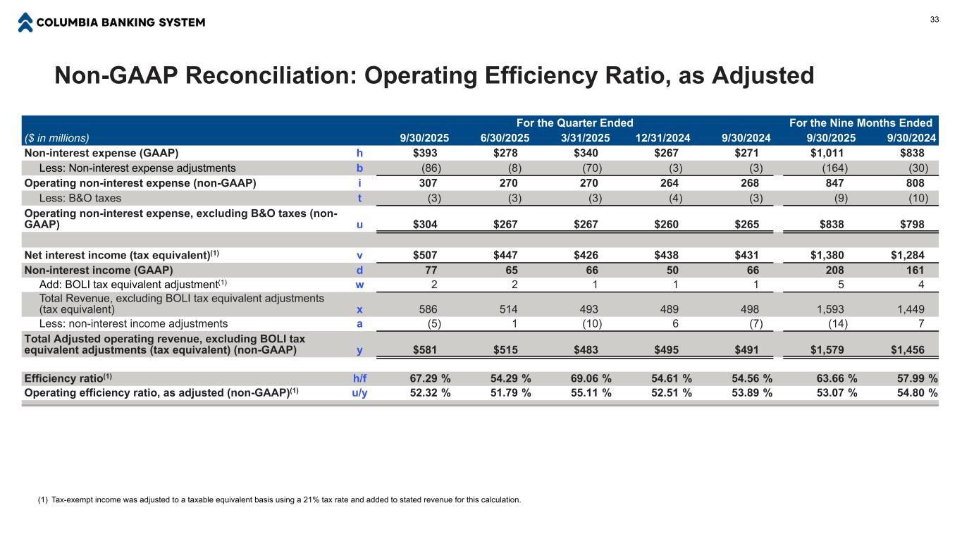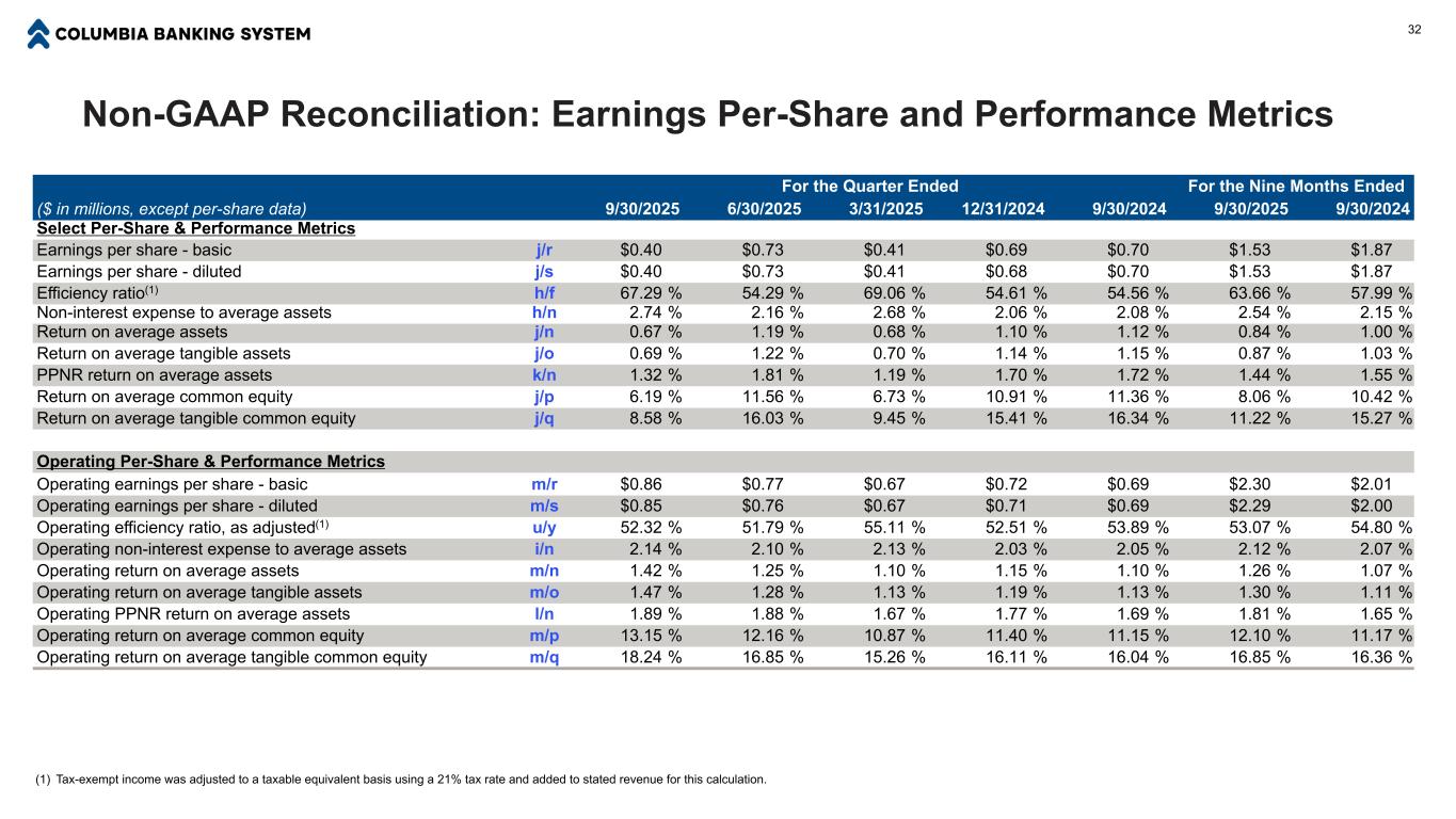 Non-GAAP Reconciliation: Earnings Per-Share and Performance Metrics For the Quarter Ended For the Nine Months Ended ($ in millions, except per-share data) 9/30/2025 6/30/2025 3/31/2025 12/31/2024 9/30/2024 9/30/2025 9/30/2024 Select Per-Share & Performance Metrics Earnings per share - basic j/r $0.40 $0.73 $0.41 $0.69 $0.70 $1.53 $1.87 Earnings per share - diluted j/s $0.40 $0.73 $0.41 $0.68 $0.70 $1.53 $1.87 Efficiency ratio(1) h/f 67.29 % 54.29 % 69.06 % 54.61 % 54.56 % 63.66 % 57.99 % Non-interest expense to average assets h/n 2.74 % 2.16 % 2.68 % 2.06 % 2.08 % 2.54 % 2.15 % Return on average assets j/n 0.67 % 1.19 % 0.68 % 1.10 % 1.12 % 0.84 % 1.00 % Return on average tangible assets j/o 0.69 % 1.22 % 0.70 % 1.14 % 1.15 % 0.87 % 1.03 % PPNR return on average assets k/n 1.32 % 1.81 % 1.19 % 1.70 % 1.72 % 1.44 % 1.55 % Return on average common equity j/p 6.19 % 11.56 % 6.73 % 10.91 % 11.36 % 8.06 % 10.42 % Return on average tangible common equity j/q 8.58 % 16.03 % 9.45 % 15.41 % 16.34 % 11.22 % 15.27 % Operating Per-Share & Performance Metrics Operating earnings per share - basic m/r $0.86 $0.77 $0.67 $0.72 $0.69 $2.30 $2.01 Operating earnings per share - diluted m/s $0.85 $0.76 $0.67 $0.71 $0.69 $2.29 $2.00 Operating efficiency ratio, as adjusted(1) u/y 52.32 % 51.79 % 55.11 % 52.51 % 53.89 % 53.07 % 54.80 % Operating non-interest expense to average assets i/n 2.14 % 2.10 % 2.13 % 2.03 % 2.05 % 2.12 % 2.07 % Operating return on average assets m/n 1.42 % 1.25 % 1.10 % 1.15 % 1.10 % 1.26 % 1.07 % Operating return on average tangible assets m/o 1.47 % 1.28 % 1.13 % 1.19 % 1.13 % 1.30 % 1.11 % Operating PPNR return on average assets l/n 1.89 % 1.88 % 1.67 % 1.77 % 1.69 % 1.81 % 1.65 % Operating return on average common equity m/p 13.15 % 12.16 % 10.87 % 11.40 % 11.15 % 12.10 % 11.17 % Operating return on average tangible common equity m/q 18.24 % 16.85 % 15.26 % 16.11 % 16.04 % 16.85 % 16.36 % (1) Tax-exempt income was adjusted to a taxable equivalent basis using a 21% tax rate and added to stated revenue for this calculation. 32