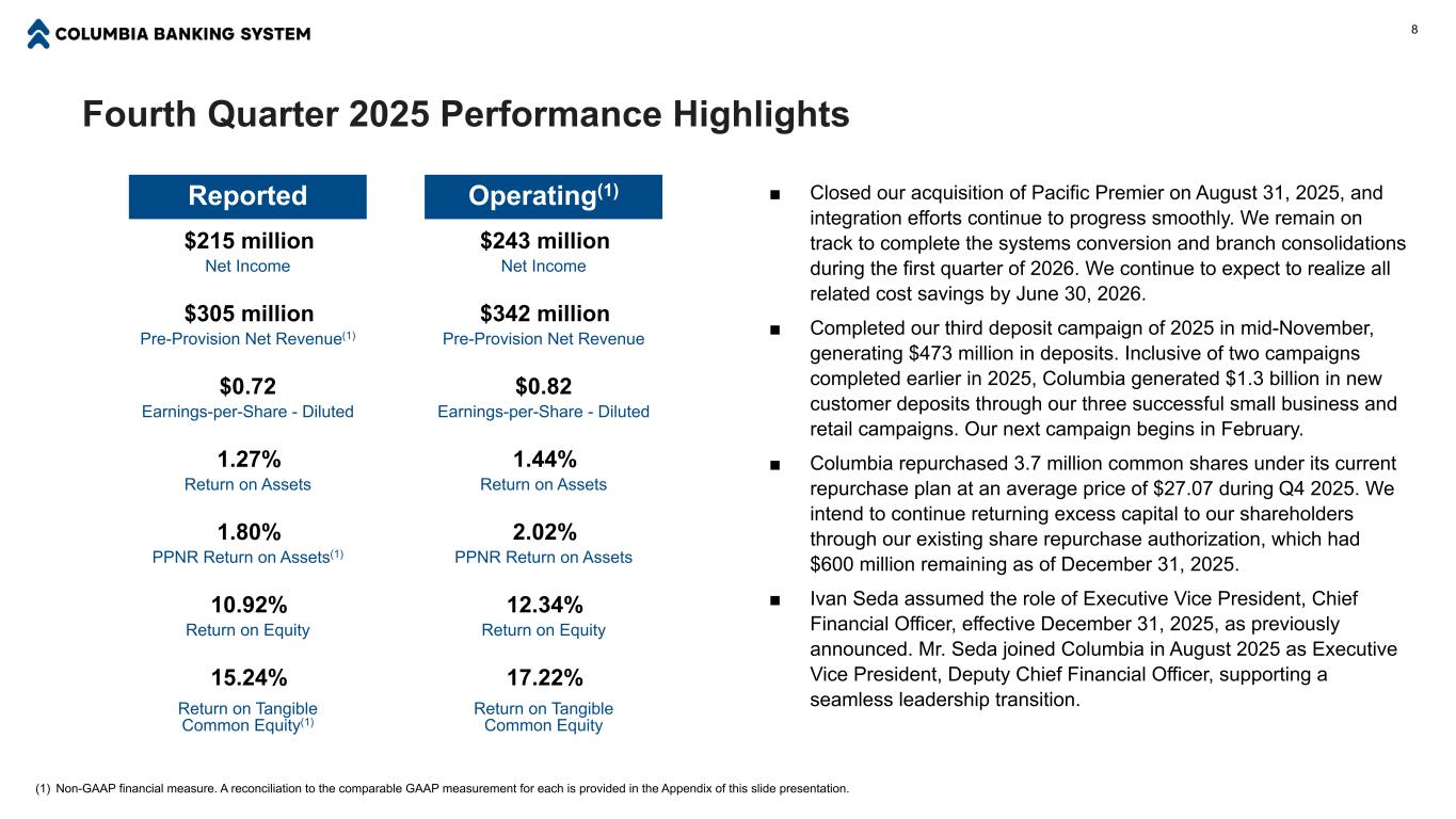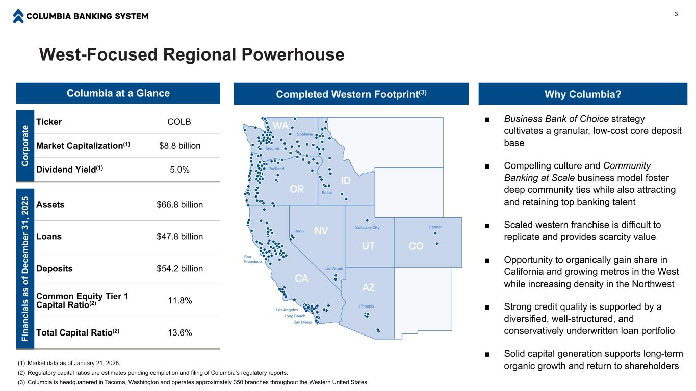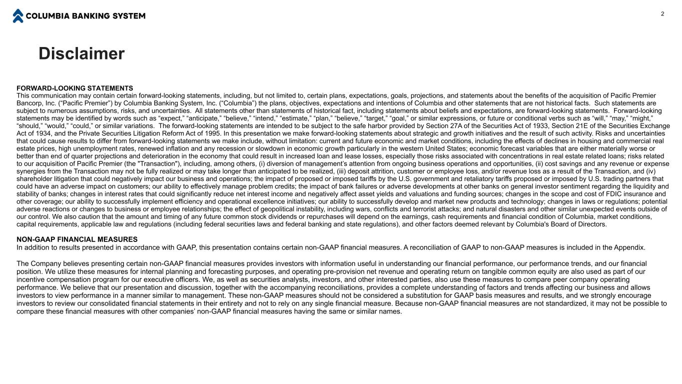 Disclaimer FORWARD-LOOKING STATEMENTS This communication may contain certain forward-looking statements, including, but not limited to, certain plans, expectations, goals, projections, and statements about the benefits of the acquisition of Pacific Premier Bancorp, Inc. (“Pacific Premier”) by Columbia Banking System, Inc. (“Columbia”) the plans, objectives, expectations and intentions of Columbia and other statements that are not historical facts. Such statements are subject to numerous assumptions, risks, and uncertainties. All statements other than statements of historical fact, including statements about beliefs and expectations, are forward-looking statements. Forward-looking statements may be identified by words such as “expect,” “anticipate,” “believe,” “intend,” “estimate,” “plan,” “believe,” “target,” “goal,” or similar expressions, or future or conditional verbs such as “will,” “may,” “might,” “should,” “would,” “could,” or similar variations. The forward-looking statements are intended to be subject to the safe harbor provided by Section 27A of the Securities Act of 1933, Section 21E of the Securities Exchange Act of 1934, and the Private Securities Litigation Reform Act of 1995. In this presentation we make forward-looking statements about strategic and growth initiatives and the result of such activity. Risks and uncertainties that could cause results to differ from forward-looking statements we make include, without limitation: current and future economic and market conditions, including the effects of declines in housing and commercial real estate prices, high unemployment rates, renewed inflation and any recession or slowdown in economic growth particularly in the western United States; economic forecast variables that are either materially worse or better than end of quarter projections and deterioration in the economy that could result in increased loan and lease losses, especially those risks associated with concentrations in real estate related loans; risks related to our acquisition of Pacific Premier (the "Transaction"), including, among others, (i) diversion of management’s attention from ongoing business operations and opportunities, (ii) cost savings and any revenue or expense synergies from the Transaction may not be fully realized or may take longer than anticipated to be realized, (iii) deposit attrition, customer or employee loss, and/or revenue loss as a result of the Transaction, and (iv) shareholder litigation that could negatively impact our business and operations; the impact of proposed or imposed tariffs by the U.S. government and retaliatory tariffs proposed or imposed by U.S. trading partners that could have an adverse impact on customers; our ability to effectively manage problem credits; the impact of bank failures or adverse developments at other banks on general investor sentiment regarding the liquidity and stability of banks; changes in interest rates that could significantly reduce net interest income and negatively affect asset yields and valuations and funding sources; changes in the scope and cost of FDIC insurance and other coverage; our ability to successfully implement efficiency and operational excellence initiatives; our ability to successfully develop and market new products and technology; changes in laws or regulations; potential adverse reactions or changes to business or employee relationships; the effect of geopolitical instability, including wars, conflicts and terrorist attacks; and natural disasters and other similar unexpected events outside of our control. We also caution that the amount and timing of any future common stock dividends or repurchases will depend on the earnings, cash requirements and financial condition of Columbia, market conditions, capital requirements, applicable law and regulations (including federal securities laws and federal banking and state regulations), and other factors deemed relevant by Columbia's Board of Directors. NON-GAAP FINANCIAL MEASURES In addition to results presented in accordance with GAAP, this presentation contains certain non-GAAP financial measures. A reconciliation of GAAP to non-GAAP measures is included in the Appendix. The Company believes presenting certain non-GAAP financial measures provides investors with information useful in understanding our financial performance, our performance trends, and our financial position. We utilize these measures for internal planning and forecasting purposes, and operating pre-provision net revenue and operating return on tangible common equity are also used as part of our incentive compensation program for our executive officers. We, as well as securities analysts, investors, and other interested parties, also use these measures to compare peer company operating performance. We believe that our presentation and discussion, together with the accompanying reconciliations, provides a complete understanding of factors and trends affecting our business and allows investors to view performance in a manner similar to management. These non-GAAP measures should not be considered a substitution for GAAP basis measures and results, and we strongly encourage investors to review our consolidated financial statements in their entirety and not to rely on any single financial measure. Because non-GAAP financial measures are not standardized, it may not be possible to compare these financial measures with other companies’ non-GAAP financial measures having the same or similar names. 2