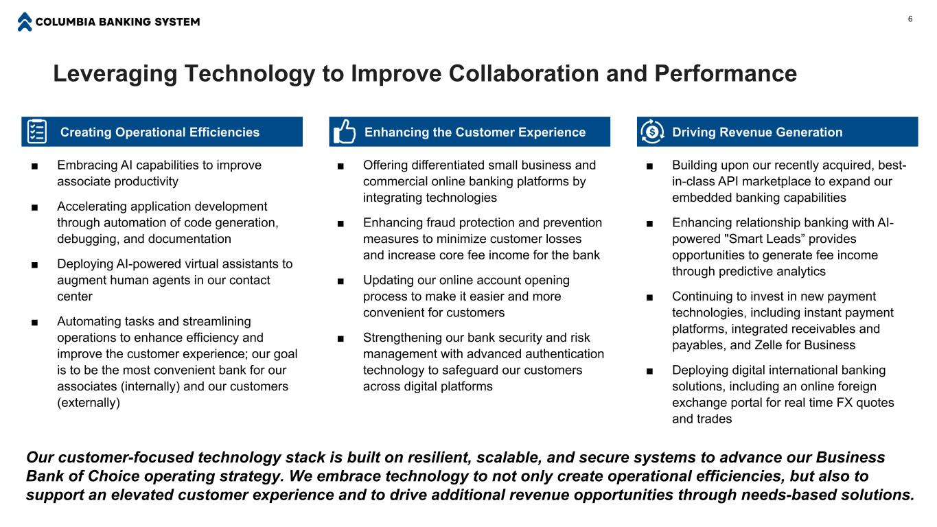 Population Deposits ($mm) COLB MSA(1) (000s) Market COLB Mkt Shr Seattle 4,201 $140,795 $7,662 5.4 % Portland 2,547 65,434 5,513 8.4 % Boise 868 17,945 224 1.3 % Spokane 608 14,405 4,045 28.1 % Opportunity to Increase Density and Gain Share throughout Our Footprint 5 Improve Competitive Position in California Broaden Presence in Other Western MarketsEnhance Density in the Northwest Population Deposits ($mm) COLB MSA(1) (000s) Market COLB Mkt Shr Phoenix 5,286 $180,133 $209 0.1 % Denver 3,080 107,870 58 0.1 % Salt Lake City 1,316 85,459 21 <0.1% Las Vegas 2,444 81,196 98 0.1 % Population Deposits ($mm) COLB MSA(1) (000s) Market COLB Mkt Shr Los Angeles 12,907 $651,914 $10,190 1.6 % Sacramento 2,472 94,585 1,884 2.0 % San Francisco 4,643 456,511 480 0.1 % San Diego 3,304 107,742 873 0.8 % (1) Population, deposit, and market share data sourced from S&P Global Market Intelligence. Deposits and market share data as of June 30, 2025, and adjusted to a pro forma basis by S&P.