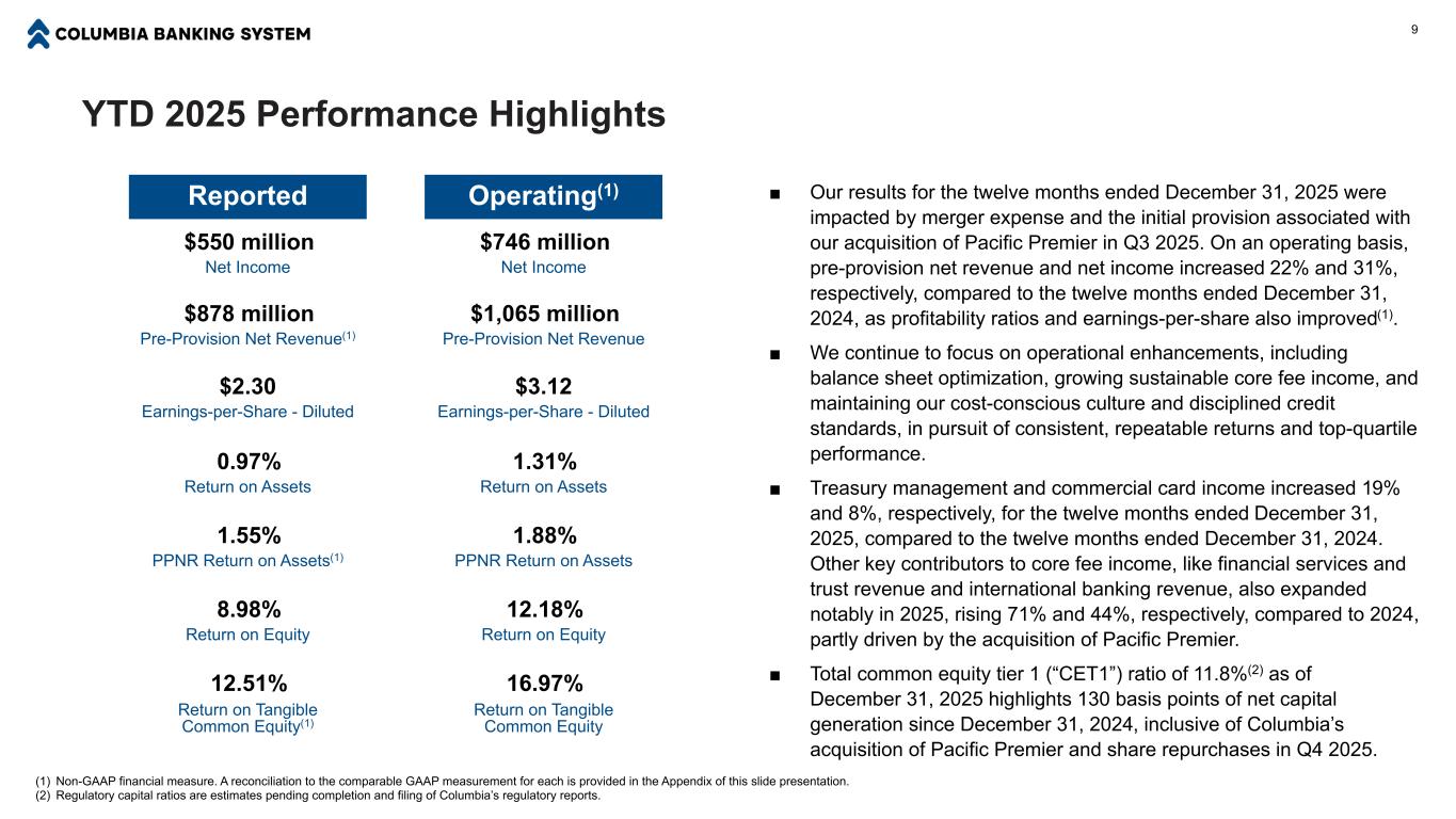 Fourth Quarter 2025 Performance Highlights 8 ■ Closed our acquisition of Pacific Premier on August 31, 2025, and integration efforts continue to progress smoothly. We remain on track to complete the systems conversion and branch consolidations during the first quarter of 2026. We continue to expect to realize all related cost savings by June 30, 2026. ■ Completed our third deposit campaign of 2025 in mid-November, generating $473 million in deposits. Inclusive of two campaigns completed earlier in 2025, Columbia generated $1.3 billion in new customer deposits through our three successful small business and retail campaigns. Our next campaign begins in February. ■ Columbia repurchased 3.7 million common shares under its current repurchase plan at an average price of $27.07 during Q4 2025. We intend to continue returning excess capital to our shareholders through our existing share repurchase authorization, which had $600 million remaining as of December 31, 2025. ■ Ivan Seda assumed the role of Executive Vice President, Chief Financial Officer, effective December 31, 2025, as previously announced. Mr. Seda joined Columbia in August 2025 as Executive Vice President, Deputy Chief Financial Officer, supporting a seamless leadership transition. Reported Operating(1) $215 million $243 million Net Income Net Income $305 million $342 million Pre-Provision Net Revenue(1) Pre-Provision Net Revenue $0.72 $0.82 Earnings-per-Share - Diluted Earnings-per-Share - Diluted 1.27% 1.44% Return on Assets Return on Assets 1.80% 2.02% PPNR Return on Assets(1) PPNR Return on Assets 10.92% 12.34% Return on Equity Return on Equity 15.24% 17.22% Return on Tangible Common Equity(1) Return on Tangible Common Equity (1) Non-GAAP financial measure. A reconciliation to the comparable GAAP measurement for each is provided in the Appendix of this slide presentation.