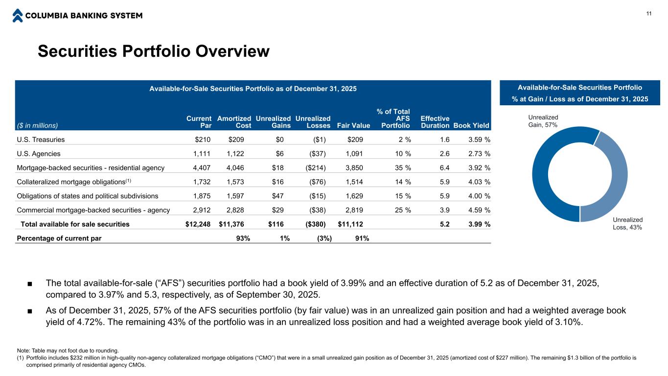 Our Diversified Commercial Bank Business Model with a Strong Retail Network Supports our Granular, High-Quality Deposit Base Non-interest, 32% Demand, 20% Money Market, 31% Savings, 5% Time, 12% Enterprise-wide Deposit Composition 10 ■ Deposits were $54.2 billion as of December 31, 2025 and represented by a granular base that is diversified by business line, industry, and geography. Our average customer account balance is $44 thousand.(1) ■ Our use of public and brokered deposits as a source of funding beyond term debt impacts the composition of our enterprise-wide deposit portfolio. We believe our customer deposit composition(1) is more illustrative of the quality of Columbia’s core deposit franchise. Our bankers’ activity is geared toward protecting the quality of our relationship-based franchise while generating net customer balance growth to reduce the need for non- core funding sources over time. Commercial, 24% Commercial - Small Business, 28% Consumer, 38% Brokered, 4% Public & Other, 6% Deposits by Category Customer Deposit Composition(1) Non-interest, 34% Demand, 20% Money Market, 31%Savings, 5% Time, 10% (1) Excludes all public, administrative, and brokered deposits, as detailed on the “Liquidity Overview” slide in the Appendix. Excluded balances accounted for 10% of total deposits as of December 31, 2025. This is a non-GAAP financial measure. $54.2 Billion $54.2 Billion $48.8 Billion