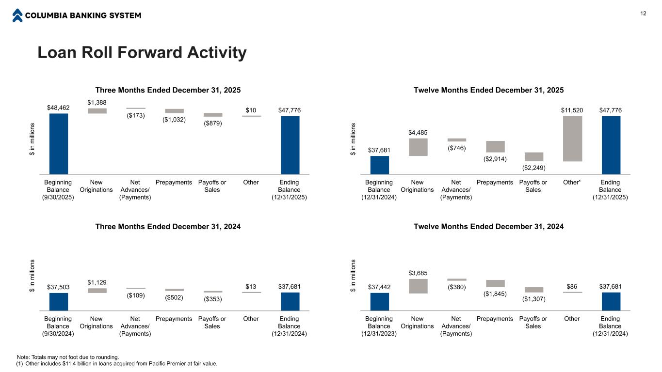 Available-for-Sale Securities Portfolio as of December 31, 2025 ($ in millions) Current Par Amortized Cost Unrealized Gains Unrealized Losses Fair Value % of Total AFS Portfolio Effective Duration Book Yield U.S. Treasuries $210 $209 $0 ($1) $209 2 % 1.6 3.59 % U.S. Agencies 1,111 1,122 $6 ($37) 1,091 10 % 2.6 2.73 % Mortgage-backed securities - residential agency 4,407 4,046 $18 ($214) 3,850 35 % 6.4 3.92 % Collateralized mortgage obligations(1) 1,732 1,573 $16 ($76) 1,514 14 % 5.9 4.03 % Obligations of states and political subdivisions 1,875 1,597 $47 ($15) 1,629 15 % 5.9 4.00 % Commercial mortgage-backed securities - agency 2,912 2,828 $29 ($38) 2,819 25 % 3.9 4.59 % Total available for sale securities $12,248 $11,376 $116 ($380) $11,112 5.2 3.99 % Percentage of current par 93% 1% (3%) 91% 11 Securities Portfolio Overview Note: Table may not foot due to rounding. (1) Portfolio includes $232 million in high-quality non-agency collateralized mortgage obligations (“CMO”) that were in a small unrealized gain position as of December 31, 2025 (amortized cost of $227 million). The remaining $1.3 billion of the portfolio is comprised primarily of residential agency CMOs. ■ The total available-for-sale (“AFS”) securities portfolio had a book yield of 3.99% and an effective duration of 5.2 as of December 31, 2025, compared to 3.97% and 5.3, respectively, as of September 30, 2025. ■ As of December 31, 2025, 57% of the AFS securities portfolio (by fair value) was in an unrealized gain position and had a weighted average book yield of 4.72%. The remaining 43% of the portfolio was in an unrealized loss position and had a weighted average book yield of 3.10%. Unrealized Gain, 57% Unrealized Loss, 43% Available-for-Sale Securities Portfolio % at Gain / Loss as of December 31, 2025