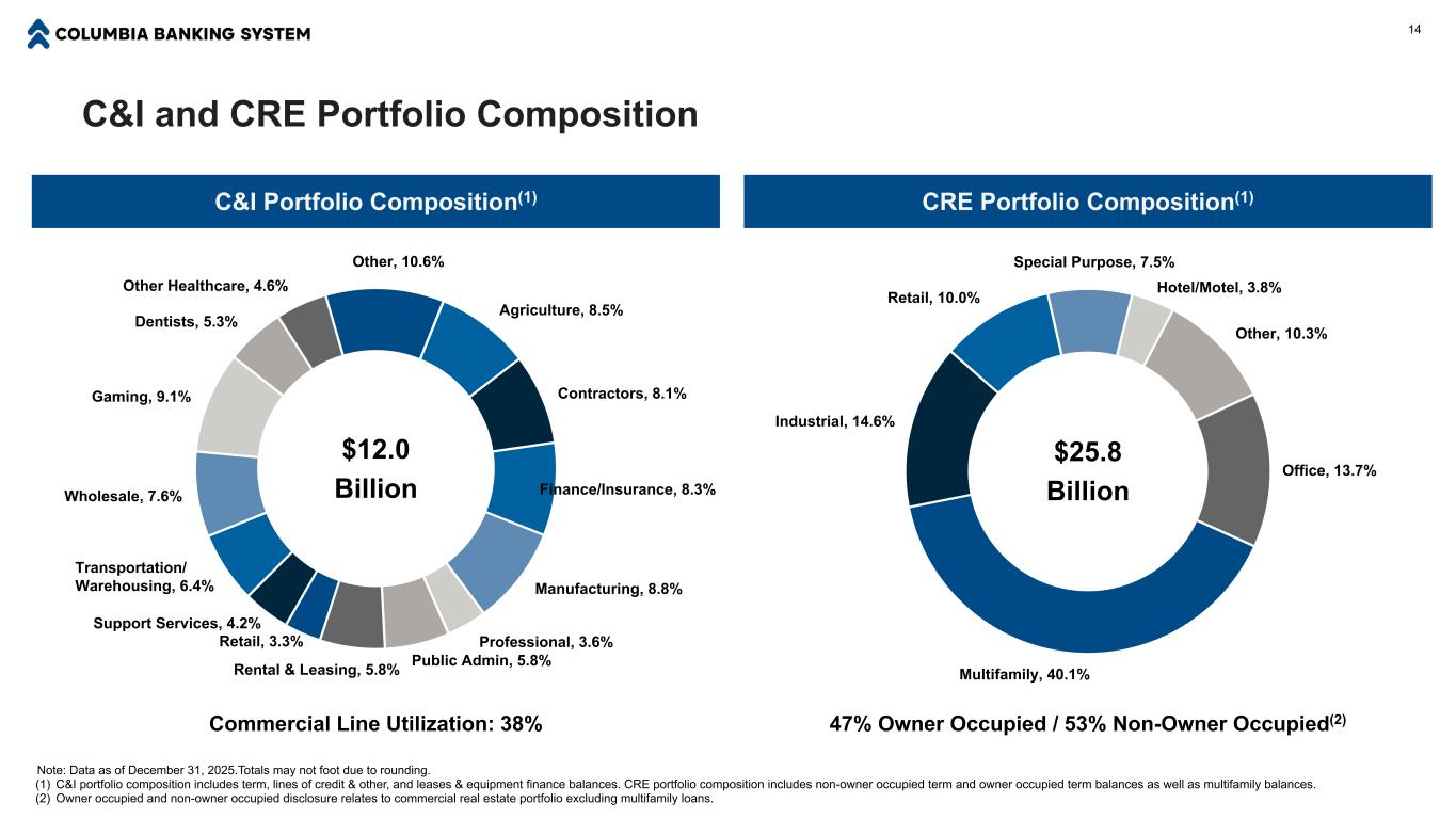 West-Focused Regional Powerhouse 3 Completed Western Footprint(3) Why Columbia? ■ Business Bank of Choice strategy cultivates a granular, low-cost core deposit base ■ Compelling culture and Community Banking at Scale business model foster deep community ties while also attracting and retaining top banking talent ■ Scaled western franchise is difficult to replicate and provides scarcity value ■ Opportunity to organically gain share in California and growing metros in the West while increasing density in the Northwest ■ Strong credit quality is supported by a diversified, well-structured, and conservatively underwritten loan portfolio ■ Solid capital generation supports long-term organic growth and return to shareholders Columbia at a Glance C or po ra te Ticker COLB Market Capitalization(1) $8.8 billion Dividend Yield(1) 5.0% Fi na nc ia ls a s of D ec em be r 3 1, 2 02 5 Assets $66.8 billion Loans $47.8 billion Deposits $54.2 billion Common Equity Tier 1 Capital Ratio(2) 11.8% Total Capital Ratio(2) 13.6% (1) Market data as of January 21, 2026. (2) Regulatory capital ratios are estimates pending completion and filing of Columbia’s regulatory reports. (3) Columbia is headquartered in Tacoma, Washington and operates approximately 350 branches throughout the Western United States.