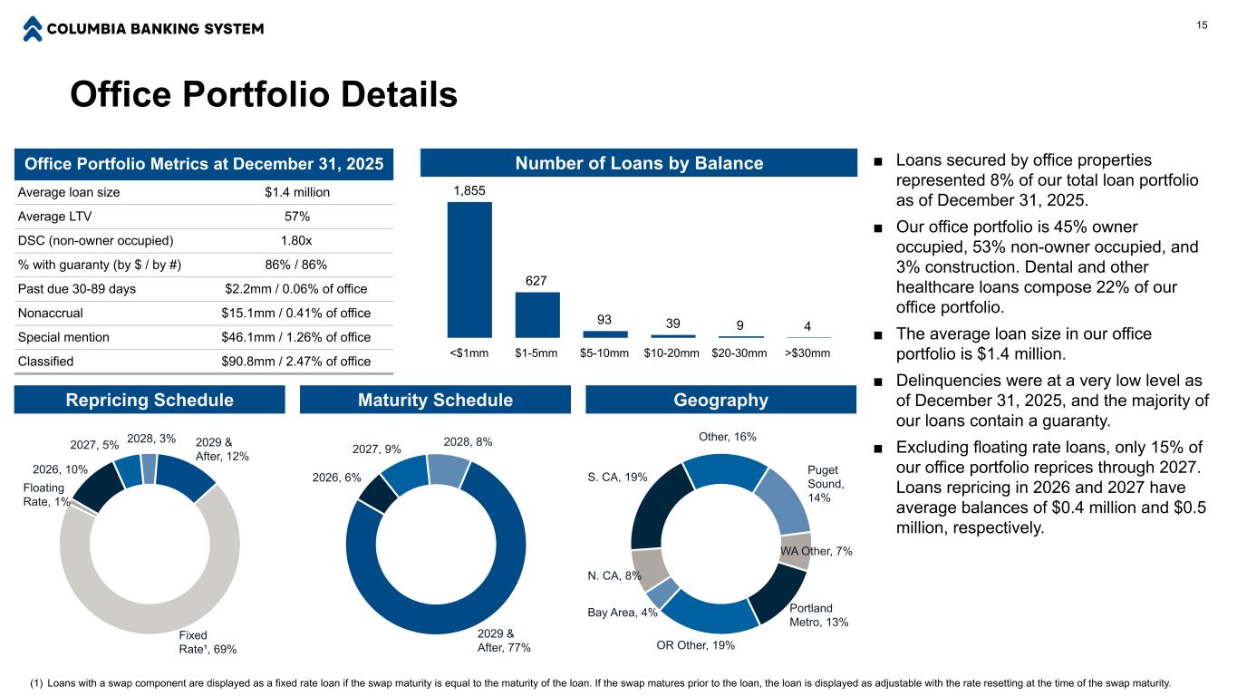 C&I and CRE Portfolio Composition Agriculture, 8.5% Contractors, 8.1% Finance/Insurance, 8.3% Manufacturing, 8.8% Professional, 3.6% Public Admin, 5.8%Rental & Leasing, 5.8% Retail, 3.3% Support Services, 4.2% Transportation/ Warehousing, 6.4% Wholesale, 7.6% Gaming, 9.1% Dentists, 5.3% Other Healthcare, 4.6% Other, 10.6% Office, 13.7% Multifamily, 40.1% Industrial, 14.6% Retail, 10.0% Special Purpose, 7.5% Hotel/Motel, 3.8% Other, 10.3% CRE Portfolio Composition(1)C&I Portfolio Composition(1) Note: Data as of December 31, 2025.Totals may not foot due to rounding. (1) C&I portfolio composition includes term, lines of credit & other, and leases & equipment finance balances. CRE portfolio composition includes non-owner occupied term and owner occupied term balances as well as multifamily balances. (2) Owner occupied and non-owner occupied disclosure relates to commercial real estate portfolio excluding multifamily loans. 47% Owner Occupied / 53% Non-Owner Occupied(2)Commercial Line Utilization: 38% 14 $12.0 Billion $25.8 Billion