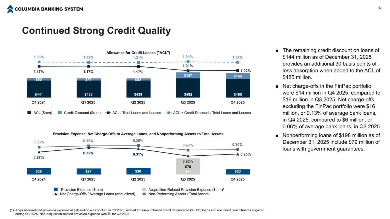 Office Portfolio Details Puget Sound, 14% WA Other, 7% Portland Metro, 13% OR Other, 19% Bay Area, 4% N. CA, 8% S. CA, 19% Other, 16% Office Portfolio Metrics at December 31, 2025 Average loan size $1.4 million Average LTV 57% DSC (non-owner occupied) 1.80x % with guaranty (by $ / by #) 86% / 86% Past due 30-89 days $2.2mm / 0.06% of office Nonaccrual $15.1mm / 0.41% of office Special mention $46.1mm / 1.26% of office Classified $90.8mm / 2.47% of office Number of Loans by Balance Geography 15 ■ Loans secured by office properties represented 8% of our total loan portfolio as of December 31, 2025. ■ Our office portfolio is 45% owner occupied, 53% non-owner occupied, and 3% construction. Dental and other healthcare loans compose 22% of our office portfolio. ■ The average loan size in our office portfolio is $1.4 million. ■ Delinquencies were at a very low level as of December 31, 2025, and the majority of our loans contain a guaranty. ■ Excluding floating rate loans, only 15% of our office portfolio reprices through 2027. Loans repricing in 2026 and 2027 have average balances of $0.4 million and $0.5 million, respectively. 1,746 441 71 38 7 6 <$1mm $1-5mm $5-10mm $10-20mm $20-30mm >$30mm 2026, 10% 2027, 5% 2028, 3% 2029 & After, 12% Fixed Rate¹, 69% Floating Rate, 1% Repricing Schedule (1) Loans with a swap component are displayed as a fixed rate loan if the swap maturity is equal to the maturity of the loan. If the swap matures prior to the loan, the loan is displayed as adjustable with the rate resetting at the time of the swap maturity. 2026, 6% 2027, 9% 2028, 8% 2029 & After, 77% Maturity Schedule , 19 8 9 6 7 1,855 627 93 9 4