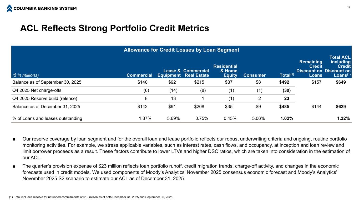 Continued Strong Credit Quality Provision Expense, Net Charge-Offs to Average Loans, and Nonperforming Assets to Total Assets $28 $27 $30 $— $23 $70 0.27% 0.32% 0.31% 0.22% 0.25% 0.33% 0.35% 0.35% 0.29% 0.30% Provision Expense ($mm) Acquisition-Related Provision Expense ($mm)¹ Net Charge-Offs / Average Loans (annualized) Non-Performing Assets / Total Assets Q4 2024 Q1 2025 Q2 2025 Q3 2025 Q4 2025 16 Allowance for Credit Losses ("ACL") $441 $438 $439 $492 $485 $60 $57 $52 $157 $144 1.17% 1.17% 1.17% 1.01% 1.02% 1.33% 1.32% 1.31% 1.34% 1.32% ACL ($mm) Credit Discount ($mm) ACL / Total Loans and Leases ACL + Credit Discount / Total Loans and Leases Q4 2024 Q1 2025 Q2 2025 Q3 2025 Q4 2025 ■ The remaining credit discount on loans of $144 million as of December 31, 2025 provides an additional 30 basis points of loss absorption when added to the ACL of $485 million. ■ Net charge-offs in the FinPac portfolio were $14 million in Q4 2025, compared to $16 million in Q3 2025. Net charge-offs excluding the FinPac portfolio were $16 million, or 0.13% of average bank loans, in Q4 2025, compared to $6 million, or 0.06% of average bank loans, in Q3 2025. ■ Nonperforming loans of $198 million as of December 31, 2025 include $79 million of loans with government guarantees. (1) Acquisition-related provision expense of $70 million was booked in Q3 2025, related to non-purchased credit deteriorated (“PCD”) loans and unfunded commitments acquired during Q3 2025. Non-acquisition-related provision expense was $0 for Q3 2025.