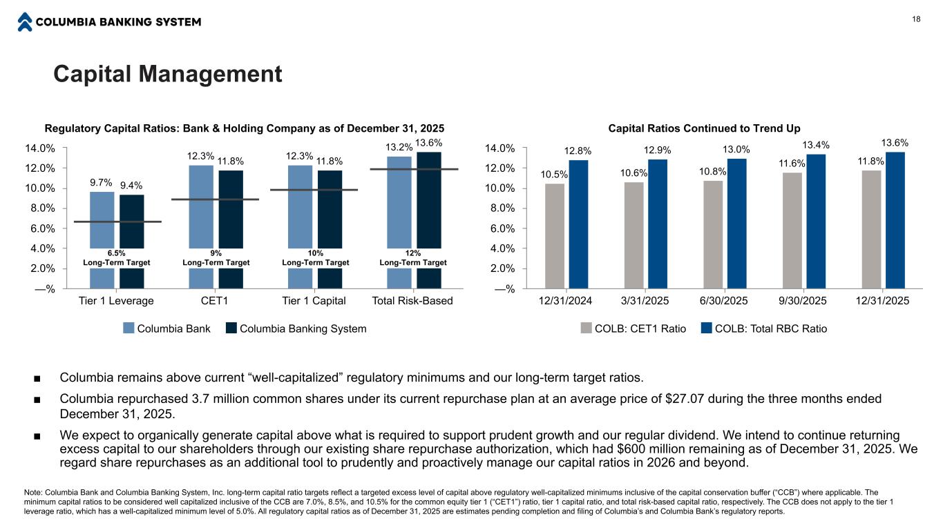 ACL Reflects Strong Portfolio Credit Metrics (1) Total includes reserve for unfunded commitments of $19 million as of both December 31, 2025 and September 30, 2025. 17 ■ Our reserve coverage by loan segment and for the overall loan and lease portfolio reflects our robust underwriting criteria and ongoing, routine portfolio monitoring activities. For example, we stress applicable variables, such as interest rates, cash flows, and occupancy, at inception and loan review and limit borrower proceeds as a result. These factors contribute to lower LTVs and higher DSC ratios, which are taken into consideration in the estimation of our ACL. ■ The quarter’s provision expense of $23 million reflects loan portfolio runoff, credit migration trends, charge-off activity, and changes in the economic forecasts used in credit models. We used components of Moody’s Analytics’ November 2025 consensus economic forecast and Moody’s Analytics’ November 2025 S2 scenario to estimate our ACL as of December 31, 2025. Allowance for Credit Losses by Loan Segment ($ in millions) Commercial Lease & Equipment Commercial Real Estate Residential & Home Equity Consumer Total(1) Remaining Credit Discount on Loans Total ACL including Credit Discount on Loans(1) Balance as of September 30, 2025 $140 $92 $215 $37 $8 $492 $157 $649 Q4 2025 Net charge-offs (6) (14) (8) (1) (1) (30) Q4 2025 Reserve build (release) 8 13 1 (1) 2 23 Balance as of December 31, 2025 $142 $91 $208 $35 $9 $485 $144 $629 % of Loans and leases outstanding 1.37% 5.69% 0.75% 0.45% 5.06% 1.02% 1.32%