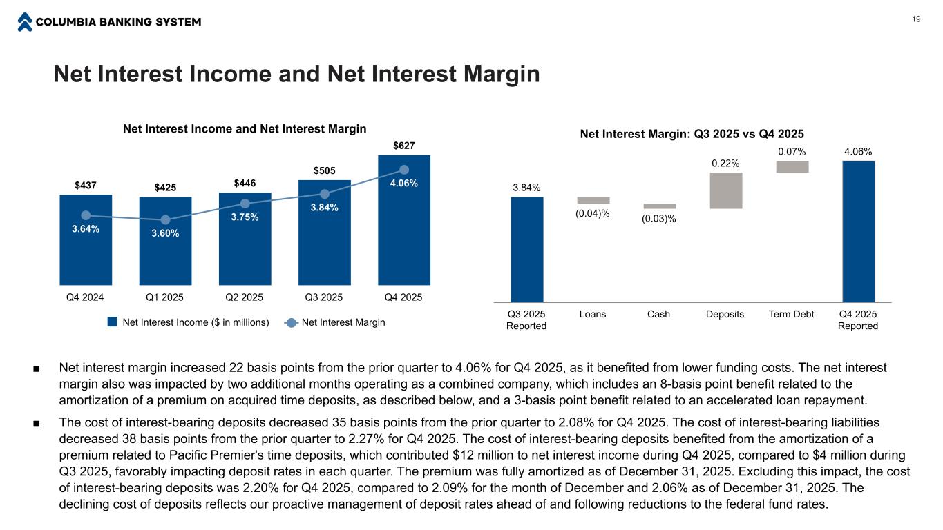 Capital Management 18 Regulatory Capital Ratios: Bank & Holding Company as of December 31, 2025 9.7% 12.3% 12.3% 13.2% 9.4% 11.8% 11.8% 13.6% Columbia Bank Columbia Banking System Tier 1 Leverage CET1 Tier 1 Capital Total Risk-Based —% 2.0% 4.0% 6.0% 8.0% 10.0% 12.0% 14.0% ■ Columbia remains above current “well-capitalized” regulatory minimums and our long-term target ratios. ■ Columbia repurchased 3.7 million common shares under its current repurchase plan at an average price of $27.07 during the three months ended December 31, 2025. ■ We expect to organically generate capital above what is required to support prudent growth and our regular dividend. We intend to continue returning excess capital to our shareholders through our existing share repurchase authorization, which had $600 million remaining as of December 31, 2025. We regard share repurchases as an additional tool to prudently and proactively manage our capital ratios in 2026 and beyond. Note: Columbia Bank and Columbia Banking System, Inc. long-term capital ratio targets reflect a targeted excess level of capital above regulatory well-capitalized minimums inclusive of the capital conservation buffer (“CCB”) where applicable. The minimum capital ratios to be considered well capitalized inclusive of the CCB are 7.0%, 8.5%, and 10.5% for the common equity tier 1 (“CET1”) ratio, tier 1 capital ratio, and total risk-based capital ratio, respectively. The CCB does not apply to the tier 1 leverage ratio, which has a well-capitalized minimum level of 5.0%. All regulatory capital ratios as of December 31, 2025 are estimates pending completion and filing of Columbia’s and Columbia Bank’s regulatory reports. Capital Ratios Continued to Trend Up 10.5% 10.6% 10.8% 11.6% 11.8% 12.8% 12.9% 13.0% 13.4% 13.6% COLB: CET1 Ratio COLB: Total RBC Ratio 12/31/2024 3/31/2025 6/30/2025 9/30/2025 12/31/2025 —% 2.0% 4.0% 6.0% 8.0% 10.0% 12.0% 14.0% 12% Long-Term Target 10% Long-Term Target 9% Long-Term Target 6.5% Long-Term Target