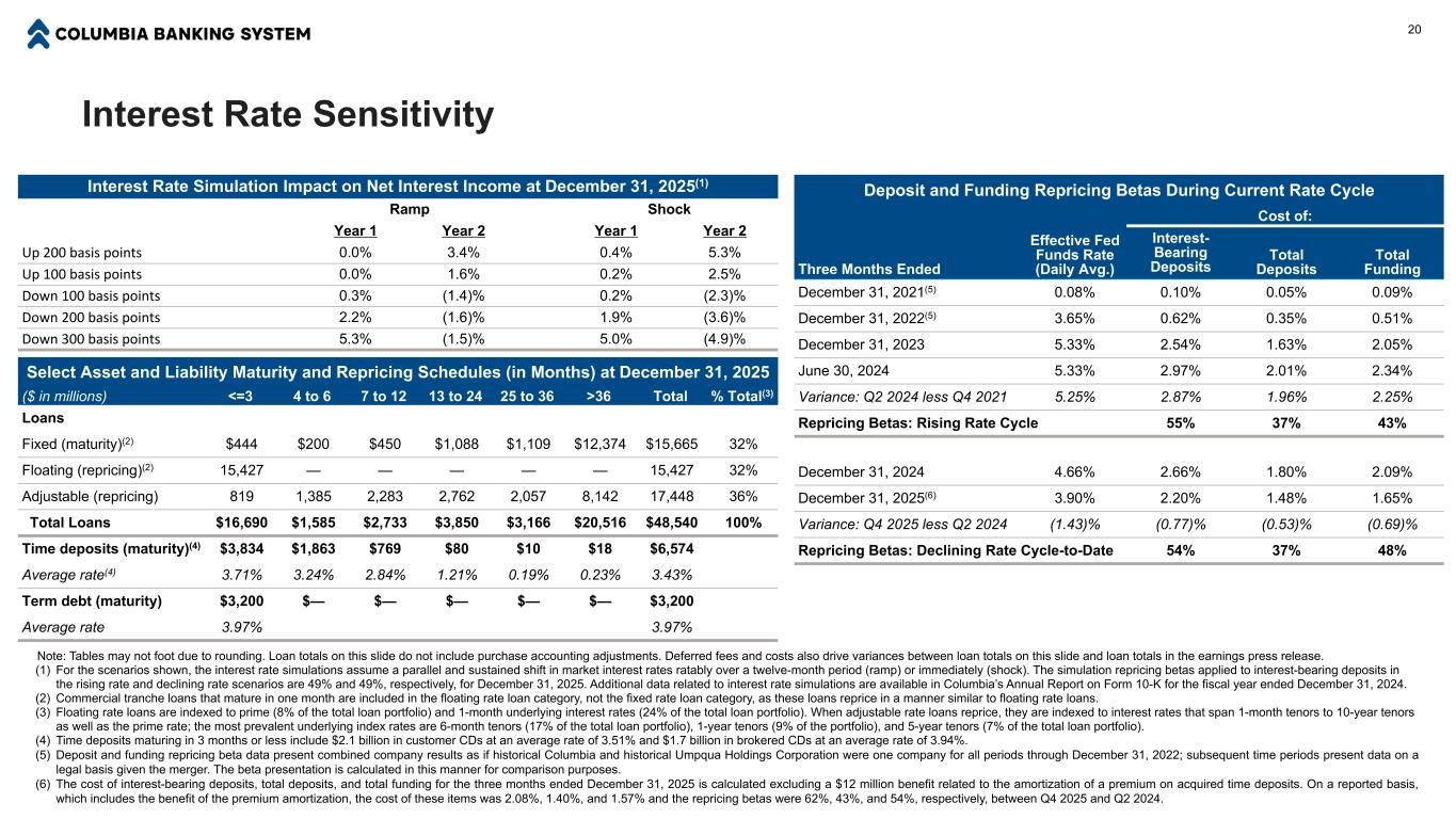 Select Asset and Liability Maturity and Repricing Schedules (in Months) at December 31, 2025 ($ in millions) <=3 4 to 6 7 to 12 13 to 24 25 to 36 >36 Total % Total(3) Loans Fixed (maturity)(2) $444 $200 $450 $1,088 $1,109 $12,374 $15,665 32% Floating (repricing)(2) 15,427 — — — — — 15,427 32% Adjustable (repricing) 819 1,385 2,283 2,762 2,057 8,142 17,448 36% Total Loans $16,690 $1,585 $2,733 $3,850 $3,166 $20,516 $48,540 100% Time deposits (maturity)(4) $3,834 $1,863 $769 $80 $10 $18 $6,574 Average rate(4) 3.71% 3.24% 2.84% 1.21% 0.19% 0.23% 3.43% Term debt (maturity) $3,200 $— $— $— $— $— $3,200 Average rate 3.97% 3.97% Interest Rate Sensitivity 20 Note: Tables may not foot due to rounding. Loan totals on this slide do not include purchase accounting adjustments. Deferred fees and costs also drive variances between loan totals on this slide and loan totals in the earnings press release. (1) For the scenarios shown, the interest rate simulations assume a parallel and sustained shift in market interest rates ratably over a twelve-month period (ramp) or immediately (shock). The simulation repricing betas applied to interest-bearing deposits in the rising rate and declining rate scenarios are 49% and 49%, respectively, for December 31, 2025. Additional data related to interest rate simulations are available in Columbia’s Annual Report on Form 10-K for the fiscal year ended December 31, 2024. (2) Commercial tranche loans that mature in one month are included in the floating rate loan category, not the fixed rate loan category, as these loans reprice in a manner similar to floating rate loans. (3) Floating rate loans are indexed to prime (8% of the total loan portfolio) and 1-month underlying interest rates (24% of the total loan portfolio). When adjustable rate loans reprice, they are indexed to interest rates that span 1-month tenors to 10-year tenors as well as the prime rate; the most prevalent underlying index rates are 6-month tenors (17% of the total loan portfolio), 1-year tenors (9% of the portfolio), and 5-year tenors (7% of the total loan portfolio). (4) Time deposits maturing in 3 months or less include $2.1 billion in customer CDs at an average rate of 3.51% and $1.7 billion in brokered CDs at an average rate of 3.94%. (5) Deposit and funding repricing beta data present combined company results as if historical Columbia and historical Umpqua Holdings Corporation were one company for all periods through December 31, 2022; subsequent time periods present data on a legal basis given the merger. The beta presentation is calculated in this manner for comparison purposes. (6) The cost of interest-bearing deposits, total deposits, and total funding for the three months ended December 31, 2025 is calculated excluding a $12 million benefit related to the amortization of a premium on acquired time deposits. On a reported basis, which includes the benefit of the premium amortization, the cost of these items was 2.08%, 1.40%, and 1.57% and the repricing betas were 62%, 43%, and 54%, respectively, between Q4 2025 and Q2 2024. Interest Rate Simulation Impact on Net Interest Income at December 31, 2025(1) Ramp Shock Year 1 Year 2 Year 1 Year 2 Up 200 basis points 0.0% 3.4% 0.4% 5.3% Up 100 basis points 0.0% 1.6% 0.2% 2.5% Down 100 basis points 0.3% (1.4)% 0.2% (2.3)% Down 200 basis points 2.2% (1.6)% 1.9% (3.6)% Down 300 basis points 5.3% (1.5)% 5.0% (4.9)% Deposit and Funding Repricing Betas During Current Rate Cycle Effective Fed Funds Rate (Daily Avg.) Cost of: Three Months Ended Interest- Bearing Deposits Total Deposits Total Funding December 31, 2021(5) 0.08% 0.10% 0.05% 0.09% December 31, 2022(5) 3.65% 0.62% 0.35% 0.51% December 31, 2023 5.33% 2.54% 1.63% 2.05% June 30, 2024 5.33% 2.97% 2.01% 2.34% Variance: Q2 2024 less Q4 2021 5.25% 2.87% 1.96% 2.25% Repricing Betas: Rising Rate Cycle 55% 37% 43% December 31, 2024 4.66% 2.66% 1.80% 2.09% December 31, 2025(6) 3.90% 2.20% 1.48% 1.65% Variance: Q4 2025 less Q2 2024 (1.43)% (0.77)% (0.53)% (0.69)% Repricing Betas: Declining Rate Cycle-to-Date 54% 37% 48%