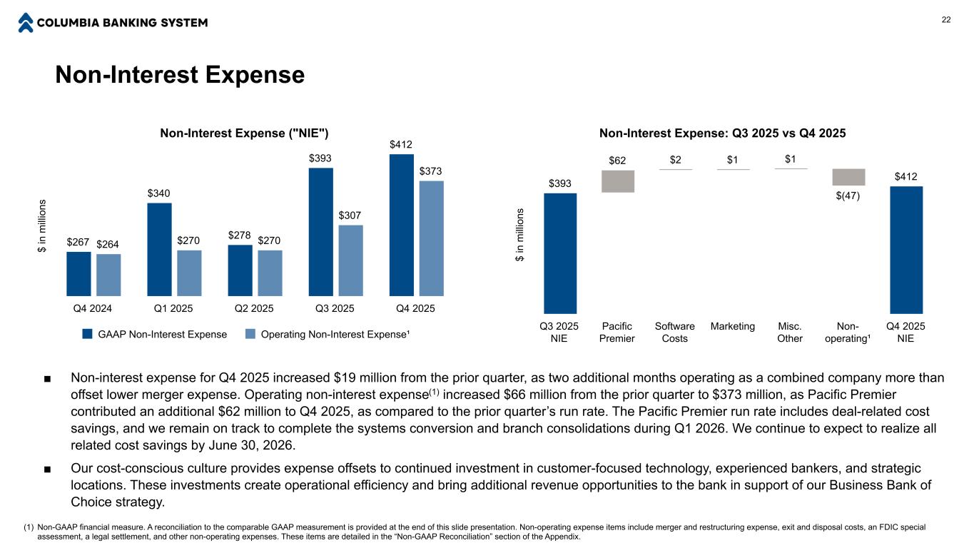 Non-Interest Income 21 $ in m ill io ns Total Non-Interest Income $50 $66 $65 $77 $90 $56 $56 $66 $72 $88 GAAP Non-Interest Income Operating Non-Interest Income¹ Q4 2024 Q1 2025 Q2 2025 Q3 2025 Q4 2025 ■ Non-interest income for Q4 2025 increased $13 million from the prior quarter. Operating non-interest income(1) increased $16 million from the prior quarter to $88 million, as Pacific Premier contributed an additional $13 million to Q4 2025’s run rate. Customer fee income, including swap and international banking revenue, drove the remainder of the increase. ■ Our Business Bank of Choice strategy incorporates a collaborative team approach to deliver needs-based solutions to our customers, which deepens relationships and provides growth in sustainable core fee income. Our trends reflect a growing contribution from treasury management, card & merchant activity, wealth management, and other product revenue over the trailing 12 months. $ in m ill io ns Operating Non-Interest Income¹ $56 $56 $66 $72 $88 Other Treasury Mgmt Card & Merchant Wealth Mgmt Deposit Services Mortgage Loan Income Q4 2024 Q1 2025 Q2 2025 Q3 2025 Q4 2025 (1) Non-GAAP financial measure. A reconciliation to the comparable GAAP measurement is provided at the end of this slide presentation. Non-operating non-interest income items include gain (loss) on investment securities, gain (loss) on swap derivatives, gain (loss) on loans held for investment at fair value, change in fair value of MSR due to valuation inputs or assumptions, and MSR hedge gain (loss). These items are detailed in the “Non-GAAP Reconciliation” section of the Appendix.