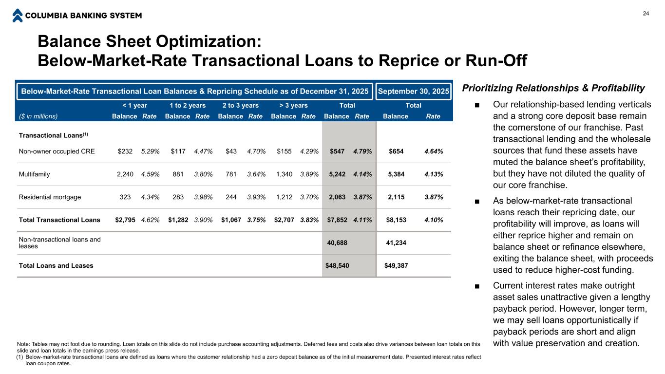 Balance Sheet Optimization: Below-Market-Rate Transactional Loans to Reprice or Run-Off 24 Below-Market-Rate Transactional Loan Balances & Repricing Schedule as of December 31, 2025 September 30, 2025 < 1 year 1 to 2 years 2 to 3 years > 3 years Total Total ($ in millions) Balance Rate Balance Rate Balance Rate Balance Rate Balance Rate Balance Rate Transactional Loans(1) Non-owner occupied CRE $232 5.29% $117 4.47% $43 4.70% $155 4.29% $547 4.79% $654 4.64% Multifamily 2,240 4.59% 881 3.80% 781 3.64% 1,340 3.89% 5,242 4.14% 5,384 4.13% Residential mortgage 323 4.34% 283 3.98% 244 3.93% 1,212 3.70% 2,063 3.87% 2,115 3.87% Total Transactional Loans $2,795 4.62% $1,282 3.90% $1,067 3.75% $2,707 3.83% $7,852 4.11% $8,153 4.10% Non-transactional loans and leases 40,688 41,234 Total Loans and Leases $48,540 $49,387 Prioritizing Relationships & Profitability ■ Our relationship-based lending verticals and a strong core deposit base remain the cornerstone of our franchise. Past transactional lending and the wholesale sources that fund these assets have muted the balance sheet’s profitability, but they have not diluted the quality of our core franchise. ■ As below-market-rate transactional loans reach their repricing date, our profitability will improve, as loans will either reprice higher and remain on balance sheet or refinance elsewhere, exiting the balance sheet, with proceeds used to reduce higher-cost funding. ■ Current interest rates make outright asset sales unattractive given a lengthy payback period. However, longer term, we may sell loans opportunistically if payback periods are short and align with value preservation and creation.Note: Tables may not foot due to rounding. Loan totals on this slide do not include purchase accounting adjustments. Deferred fees and costs also drive variances between loan totals on this slide and loan totals in the earnings press release. (1) Below-market-rate transactional loans are defined as loans where the customer relationship had a zero deposit balance as of the initial measurement date. Presented interest rates reflect loan coupon rates.
