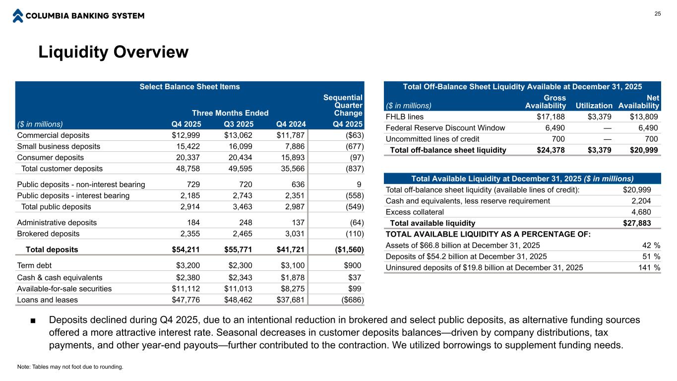 Liquidity Overview Total Available Liquidity at December 31, 2025 ($ in millions) Total off-balance sheet liquidity (available lines of credit): $20,999 Cash and equivalents, less reserve requirement 2,204 Excess collateral 4,680 Total available liquidity $27,883 TOTAL AVAILABLE LIQUIDITY AS A PERCENTAGE OF: Assets of $66.8 billion at December 31, 2025 42 % Deposits of $54.2 billion at December 31, 2025 51 % Uninsured deposits of $19.8 billion at December 31, 2025 141 % Total Off-Balance Sheet Liquidity Available at December 31, 2025 ($ in millions) Gross Availability Utilization Net Availability FHLB lines $17,188 $3,379 $13,809 Federal Reserve Discount Window 6,490 — 6,490 Uncommitted lines of credit 700 — 700 Total off-balance sheet liquidity $24,378 $3,379 $20,999 25 ■ Deposits declined during Q4 2025, due to an intentional reduction in brokered and select public deposits, as alternative funding sources offered a more attractive interest rate. Seasonal decreases in customer deposits balances—driven by company distributions, tax payments, and other year-end payouts—further contributed to the contraction. We utilized borrowings to supplement funding needs. Select Balance Sheet Items Three Months Ended Sequential Quarter Change ($ in millions) Q4 2025 Q3 2025 Q4 2024 Q4 2025 Commercial deposits $12,999 $13,062 $11,787 ($63) Small business deposits 15,422 16,099 7,886 (677) Consumer deposits 20,337 20,434 15,893 (97) Total customer deposits 48,758 49,595 35,566 (837) Public deposits - non-interest bearing 729 720 636 9 Public deposits - interest bearing 2,185 2,743 2,351 (558) Total public deposits 2,914 3,463 2,987 (549) Administrative deposits 184 248 137 (64) Brokered deposits 2,355 2,465 3,031 (110) Total deposits $54,211 $55,771 $41,721 ($1,560) Term debt $3,200 $2,300 $3,100 $900 Cash & cash equivalents $2,380 $2,343 $1,878 $37 Available-for-sale securities $11,112 $11,013 $8,275 $99 Loans and leases $47,776 $48,462 $37,681 ($686) Note: Tables may not foot due to rounding.