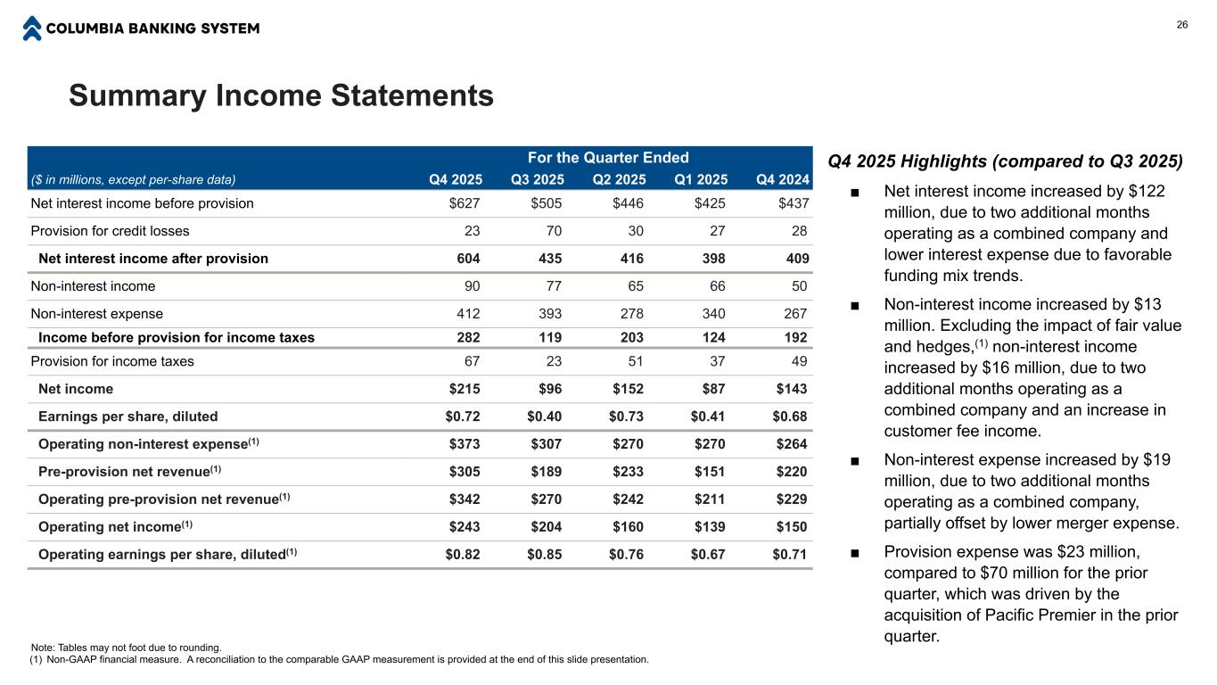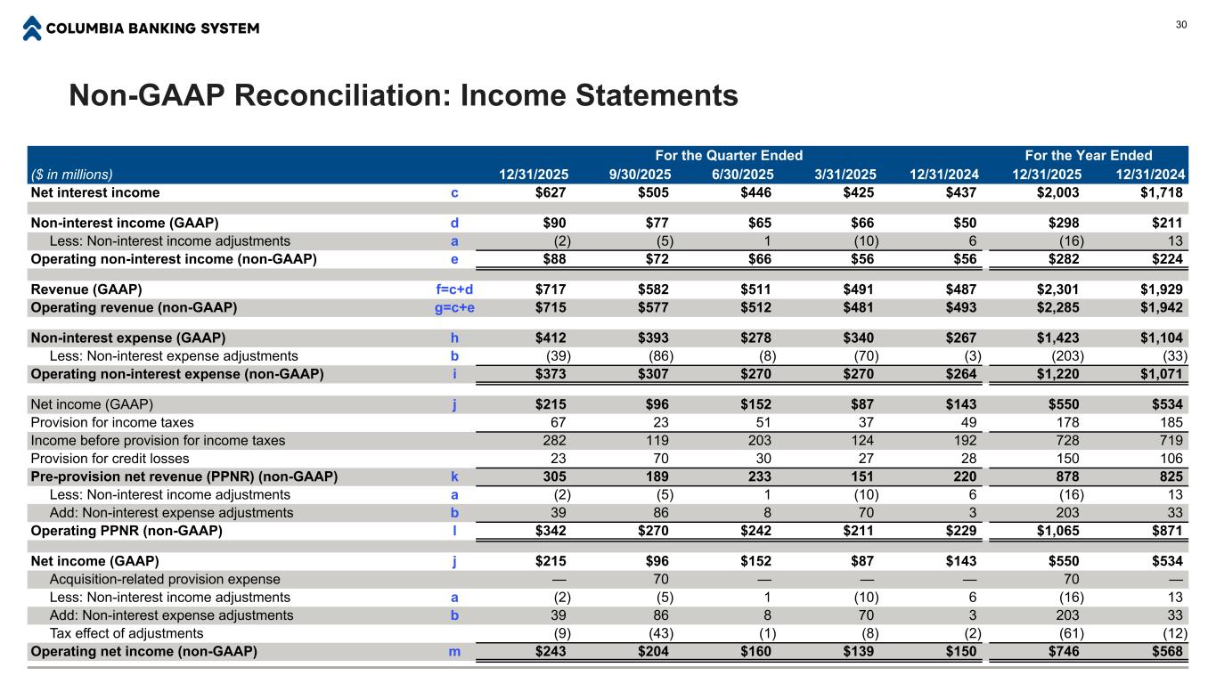 Non-GAAP Reconciliation: Income Statements For the Quarter Ended For the Year Ended ($ in millions) 12/31/2025 9/30/2025 6/30/2025 3/31/2025 12/31/2024 12/31/2025 12/31/2024 Net interest income c $627 $505 $446 $425 $437 $2,003 $1,718 Non-interest income (GAAP) d $90 $77 $65 $66 $50 $298 $211 Less: Non-interest income adjustments a (2) (5) 1 (10) 6 (16) 13 Operating non-interest income (non-GAAP) e $88 $72 $66 $56 $56 $282 $224 Revenue (GAAP) f=c+d $717 $582 $511 $491 $487 $2,301 $1,929 Operating revenue (non-GAAP) g=c+e $715 $577 $512 $481 $493 $2,285 $1,942 Non-interest expense (GAAP) h $412 $393 $278 $340 $267 $1,423 $1,104 Less: Non-interest expense adjustments b (39) (86) (8) (70) (3) (203) (33) Operating non-interest expense (non-GAAP) i $373 $307 $270 $270 $264 $1,220 $1,071 Net income (GAAP) j $215 $96 $152 $87 $143 $550 $534 Provision for income taxes 67 23 51 37 49 178 185 Income before provision for income taxes 282 119 203 124 192 728 719 Provision for credit losses 23 70 30 27 28 150 106 Pre-provision net revenue (PPNR) (non-GAAP) k 305 189 233 151 220 878 825 Less: Non-interest income adjustments a (2) (5) 1 (10) 6 (16) 13 Add: Non-interest expense adjustments b 39 86 8 70 3 203 33 Operating PPNR (non-GAAP) l $342 $270 $242 $211 $229 $1,065 $871 Net income (GAAP) j $215 $96 $152 $87 $143 $550 $534 Acquisition-related provision expense — 70 — — — 70 — Less: Non-interest income adjustments a (2) (5) 1 (10) 6 (16) 13 Add: Non-interest expense adjustments b 39 86 8 70 3 203 33 Tax effect of adjustments (9) (43) (1) (8) (2) (61) (12) Operating net income (non-GAAP) m $243 $204 $160 $139 $150 $746 $568 30