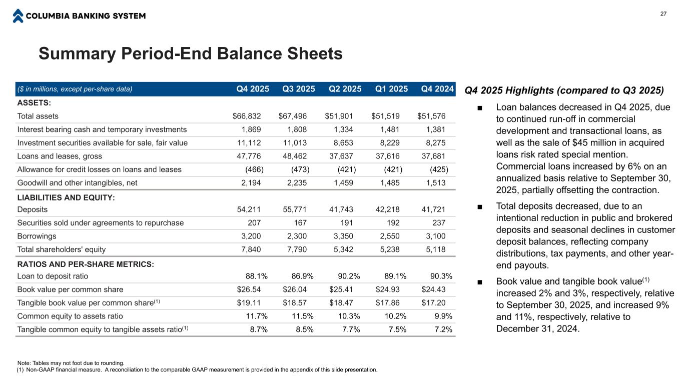 Summary Income Statements Note: Tables may not foot due to rounding. (1) Non-GAAP financial measure. A reconciliation to the comparable GAAP measurement is provided at the end of this slide presentation. For the Quarter Ended ($ in millions, except per-share data) Q4 2025 Q3 2025 Q2 2025 Q1 2025 Q4 2024 Net interest income before provision $627 $505 $446 $425 $437 Provision for credit losses 23 70 30 27 28 Net interest income after provision 604 435 416 398 409 Non-interest income 90 77 65 66 50 Non-interest expense 412 393 278 340 267 Income before provision for income taxes 282 119 203 124 192 Provision for income taxes 67 23 51 37 49 Net income $215 $96 $152 $87 $143 Earnings per share, diluted $0.72 $0.40 $0.73 $0.41 $0.68 Operating non-interest expense(1) $373 $307 $270 $270 $264 Pre-provision net revenue(1) $305 $189 $233 $151 $220 Operating pre-provision net revenue(1) $342 $270 $242 $211 $229 Operating net income(1) $243 $204 $160 $139 $150 Operating earnings per share, diluted(1) $0.82 $0.85 $0.76 $0.67 $0.71 26 Q4 2025 Highlights (compared to Q3 2025) ■ Net interest income increased by $122 million, due to two additional months operating as a combined company and lower interest expense due to favorable funding mix trends. ■ Non-interest income increased by $13 million. Excluding the impact of fair value and hedges,(1) non-interest income increased by $16 million, due to two additional months operating as a combined company and an increase in customer fee income. ■ Non-interest expense increased by $19 million, due to two additional months operating as a combined company, partially offset by lower merger expense. ■ Provision expense was $23 million, compared to $70 million for the prior quarter, which was driven by the acquisition of Pacific Premier in the prior quarter.