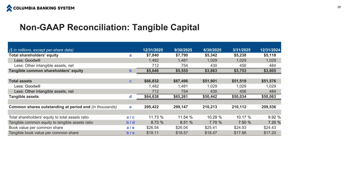 Summary Period-End Balance Sheets Note: Tables may not foot due to rounding. (1) Non-GAAP financial measure. A reconciliation to the comparable GAAP measurement is provided in the appendix of this slide presentation. ($ in millions, except per-share data) Q4 2025 Q3 2025 Q2 2025 Q1 2025 Q4 2024 ASSETS: Total assets $66,832 $67,496 $51,901 $51,519 $51,576 Interest bearing cash and temporary investments 1,869 1,808 1,334 1,481 1,381 Investment securities available for sale, fair value 11,112 11,013 8,653 8,229 8,275 Loans and leases, gross 47,776 48,462 37,637 37,616 37,681 Allowance for credit losses on loans and leases (466) (473) (421) (421) (425) Goodwill and other intangibles, net 2,194 2,235 1,459 1,485 1,513 LIABILITIES AND EQUITY: Deposits 54,211 55,771 41,743 42,218 41,721 Securities sold under agreements to repurchase 207 167 191 192 237 Borrowings 3,200 2,300 3,350 2,550 3,100 Total shareholders' equity 7,840 7,790 5,342 5,238 5,118 RATIOS AND PER-SHARE METRICS: Loan to deposit ratio 88.1% 86.9% 90.2% 89.1% 90.3% Book value per common share $26.54 $26.04 $25.41 $24.93 $24.43 Tangible book value per common share(1) $19.11 $18.57 $18.47 $17.86 $17.20 Common equity to assets ratio 11.7% 11.5% 10.3% 10.2% 9.9% Tangible common equity to tangible assets ratio(1) 8.7% 8.5% 7.7% 7.5% 7.2% 27 Q4 2025 Highlights (compared to Q3 2025) ■ Loan balances decreased in Q4 2025, due to continued run-off in commercial development and transactional loans, as well as the sale of $45 million in acquired loans risk rated special mention. Commercial loans increased by 6% on an annualized basis relative to September 30, 2025, partially offsetting the contraction. ■ Total deposits decreased, due to an intentional reduction in public and brokered deposits and seasonal declines in customer deposit balances, reflecting company distributions, tax payments, and other year- end payouts. ■ Book value and tangible book value(1) increased 2% and 3%, respectively, relative to September 30, 2025, and increased 9% and 11%, respectively, relative to December 31, 2024.
