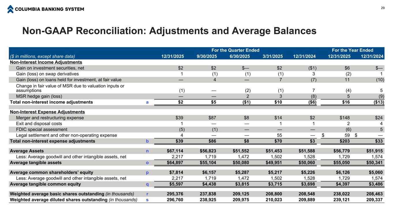 Non-GAAP Reconciliation: Adjustments and Average Balances For the Quarter Ended For the Year Ended ($ in millions, except share data) 12/31/2025 9/30/2025 6/30/2025 3/31/2025 12/31/2024 12/31/2025 12/31/2024 Non-Interest Income Adjustments Gain on investment securities, net $2 $2 $— $2 ($1) $6 $— Gain (loss) on swap derivatives 1 (1) (1) (1) 3 (2) 1 Gain (loss) on loans held for investment, at fair value — 4 — 7 (7) 11 (10) Change in fair value of MSR due to valuation inputs or assumptions (1) — (2) (1) 7 (4) 5 MSR hedge gain (loss) — — 2 3 (8) 5 (9) Total non-interest income adjustments a $2 $5 ($1) $10 ($6) $16 ($13) Non-Interest Expense Adjustments Merger and restructuring expense $39 $87 $8 $14 $2 $148 $24 Exit and disposal costs 1 — — 1 1 2 4 FDIC special assessment (5) (1) — — — (6) 5 Legal settlement and other non-operating expense 4 — — 55 — $ 59 $ — Total non-interest expense adjustments b $39 $86 $8 $70 $3 $203 $33 Average Assets n $67,114 $56,823 $51,552 $51,453 $51,588 $56,779 $51,915 Less: Average goodwill and other intangible assets, net 2,217 1,719 1,472 1,502 1,528 1,729 1,574 Average tangible assets o $64,897 $55,104 $50,080 $49,951 $50,060 $55,050 $50,341 Average common shareholders’ equity p $7,814 $6,157 $5,287 $5,217 $5,226 $6,126 $5,060 Less: Average goodwill and other intangible assets, net 2,217 1,719 1,472 1,502 1,528 1,729 1,574 Average tangible common equity q $5,597 $4,438 $3,815 $3,715 $3,698 $4,397 $3,486 Weighted average basic shares outstanding (in thousands) r 295,376 237,838 209,125 208,800 208,548 238,022 208,463 Weighted average diluted shares outstanding (in thousands) s 296,760 238,925 209,975 210,023 209,889 239,121 209,337 29