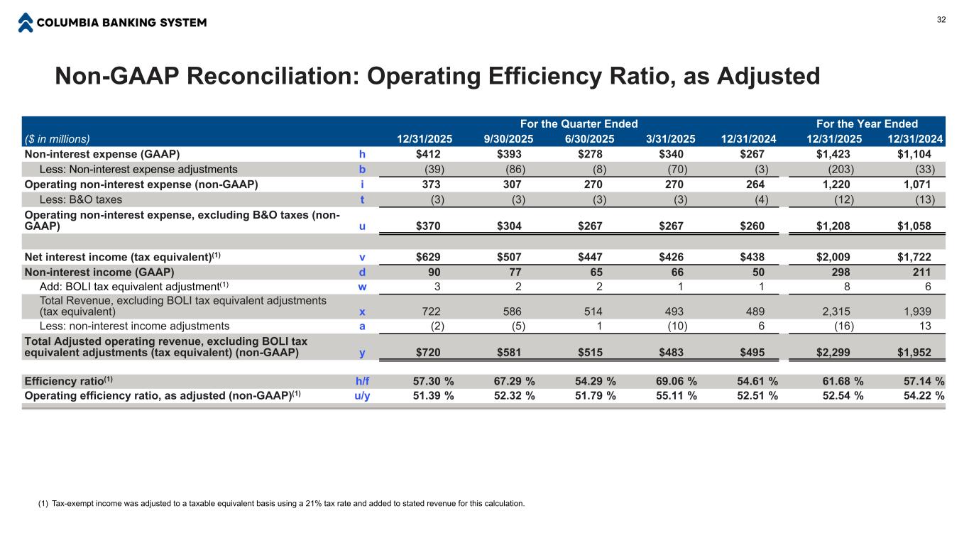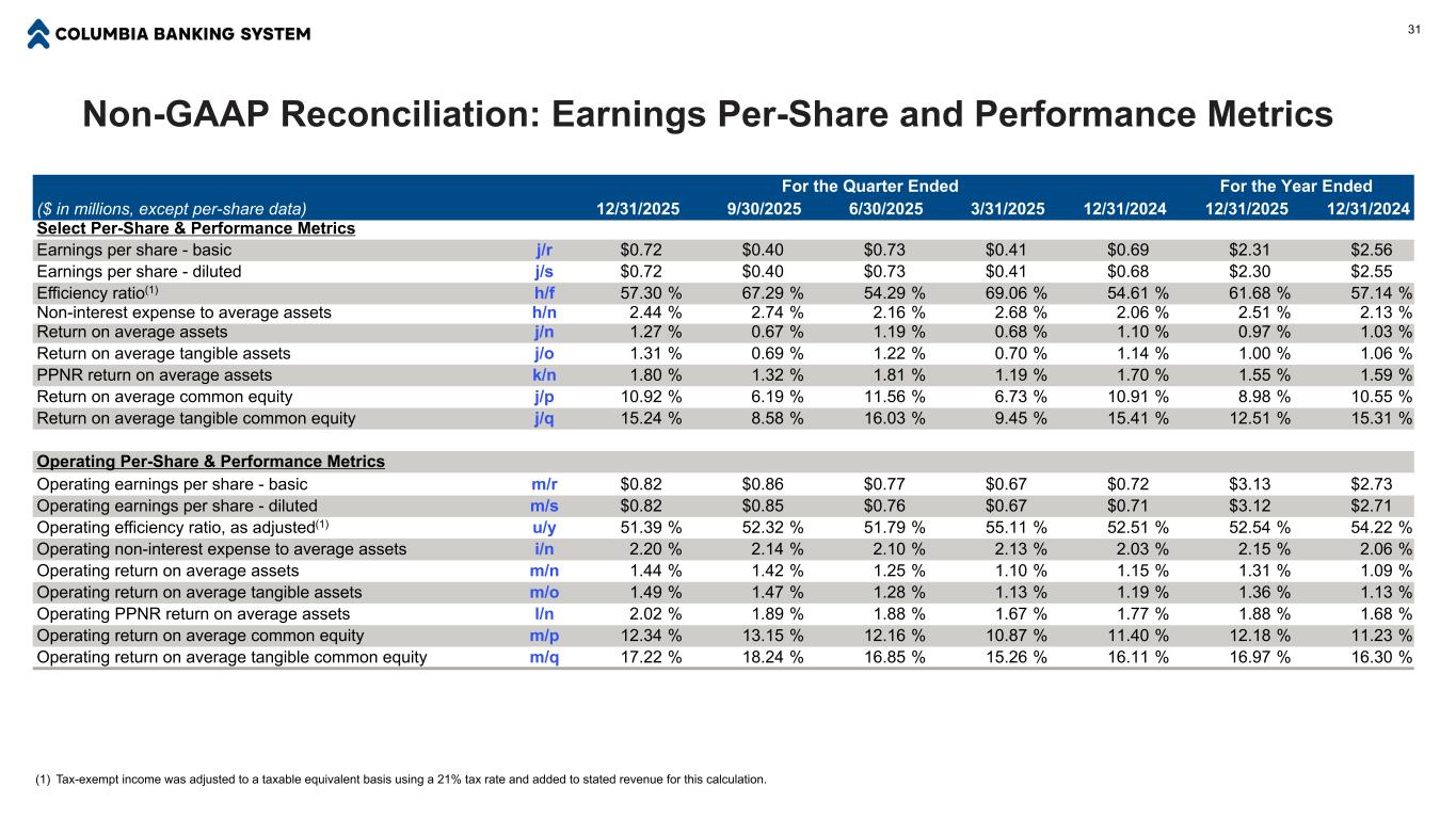 Non-GAAP Reconciliation: Earnings Per-Share and Performance Metrics For the Quarter Ended For the Year Ended ($ in millions, except per-share data) 12/31/2025 9/30/2025 6/30/2025 3/31/2025 12/31/2024 12/31/2025 12/31/2024 Select Per-Share & Performance Metrics Earnings per share - basic j/r $0.72 $0.40 $0.73 $0.41 $0.69 $2.31 $2.56 Earnings per share - diluted j/s $0.72 $0.40 $0.73 $0.41 $0.68 $2.30 $2.55 Efficiency ratio(1) h/f 57.30 % 67.29 % 54.29 % 69.06 % 54.61 % 61.68 % 57.14 % Non-interest expense to average assets h/n 2.44 % 2.74 % 2.16 % 2.68 % 2.06 % 2.51 % 2.13 % Return on average assets j/n 1.27 % 0.67 % 1.19 % 0.68 % 1.10 % 0.97 % 1.03 % Return on average tangible assets j/o 1.31 % 0.69 % 1.22 % 0.70 % 1.14 % 1.00 % 1.06 % PPNR return on average assets k/n 1.80 % 1.32 % 1.81 % 1.19 % 1.70 % 1.55 % 1.59 % Return on average common equity j/p 10.92 % 6.19 % 11.56 % 6.73 % 10.91 % 8.98 % 10.55 % Return on average tangible common equity j/q 15.24 % 8.58 % 16.03 % 9.45 % 15.41 % 12.51 % 15.31 % Operating Per-Share & Performance Metrics Operating earnings per share - basic m/r $0.82 $0.86 $0.77 $0.67 $0.72 $3.13 $2.73 Operating earnings per share - diluted m/s $0.82 $0.85 $0.76 $0.67 $0.71 $3.12 $2.71 Operating efficiency ratio, as adjusted(1) u/y 51.39 % 52.32 % 51.79 % 55.11 % 52.51 % 52.54 % 54.22 % Operating non-interest expense to average assets i/n 2.20 % 2.14 % 2.10 % 2.13 % 2.03 % 2.15 % 2.06 % Operating return on average assets m/n 1.44 % 1.42 % 1.25 % 1.10 % 1.15 % 1.31 % 1.09 % Operating return on average tangible assets m/o 1.49 % 1.47 % 1.28 % 1.13 % 1.19 % 1.36 % 1.13 % Operating PPNR return on average assets l/n 2.02 % 1.89 % 1.88 % 1.67 % 1.77 % 1.88 % 1.68 % Operating return on average common equity m/p 12.34 % 13.15 % 12.16 % 10.87 % 11.40 % 12.18 % 11.23 % Operating return on average tangible common equity m/q 17.22 % 18.24 % 16.85 % 15.26 % 16.11 % 16.97 % 16.30 % (1) Tax-exempt income was adjusted to a taxable equivalent basis using a 21% tax rate and added to stated revenue for this calculation. 31