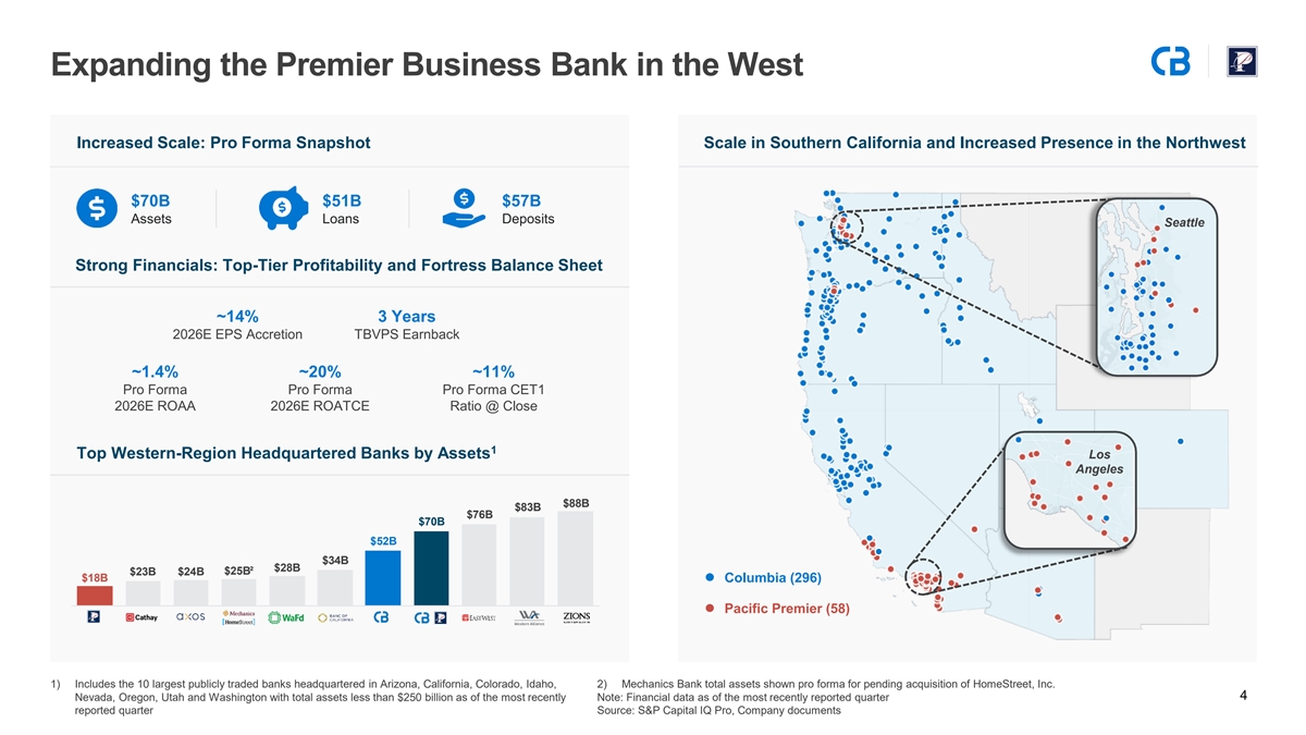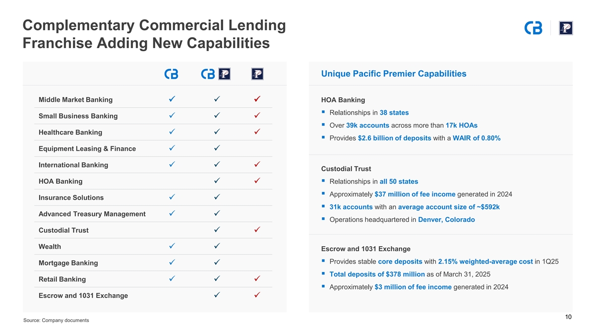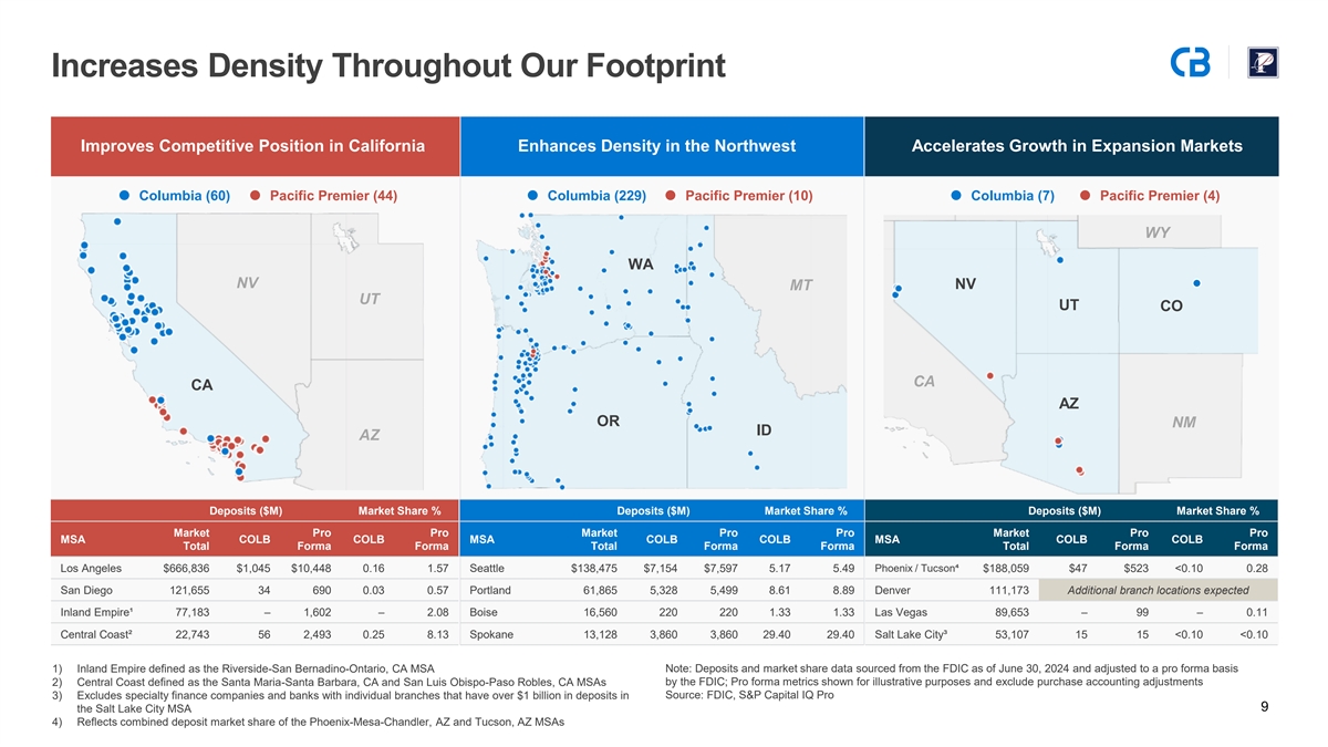 Increases Density Throughout Our Footprint Improves Competitive Position in California Enhances Density in the Northwest Accelerates Growth in Expansion Markets Columbia (60) Pacific Premier (44) Columbia (229) Pacific Premier (10) Columbia (7) Pacific Premier (4) WY WA NV NV MT UT UT CO CA CA AZ OR NM ID AZ Deposits ($M) Market Share % Deposits ($M) Market Share % Deposits ($M) Market Share % Market Pro Pro Market Pro Pro Market Pro Pro MSA COLB COLB MSA COLB COLB MSA COLB COLB Total Forma Forma Total Forma Forma Total Forma Forma Phoenix / Tucson⁴ Los Angeles $666,836 $1,045 $10,448 0.16 1.57 Seattle $138,475 $7,154 $7,597 5.17 5.49 $188,059 $47 $523 <0.10 0.28 San Diego 121,655 34 690 0.03 0.57 Portland 61,865 5,328 5,499 8.61 8.89 Denver 111,173 Additional branch locations expected Inland Empire¹ 77,183 – 1,602 – 2.08 Boise 16,560 220 220 1.33 1.33 Las Vegas 89,653 – 99 – 0.11 Central Coast² 22,743 56 2,493 0.25 8.13 Spokane 13,128 3,860 3,860 29.40 29.40 Salt Lake City³ 53,107 15 15 <0.10 <0.10 1) Inland Empire defined as the Riverside-San Bernadino-Ontario, CA MSA Note: Deposits and market share data sourced from the FDIC as of June 30, 2024 and adjusted to a pro forma basis 2) Central Coast defined as the Santa Maria-Santa Barbara, CA and San Luis Obispo-Paso Robles, CA MSAs by the FDIC; Pro forma metrics shown for illustrative purposes and exclude purchase accounting adjustments Source: FDIC, S&P Capital IQ Pro 3) Excludes specialty finance companies and banks with individual branches that have over $1 billion in deposits in 9 the Salt Lake City MSA 4) Reflects combined deposit market share of the Phoenix-Mesa-Chandler, AZ and Tucson, AZ MSAs