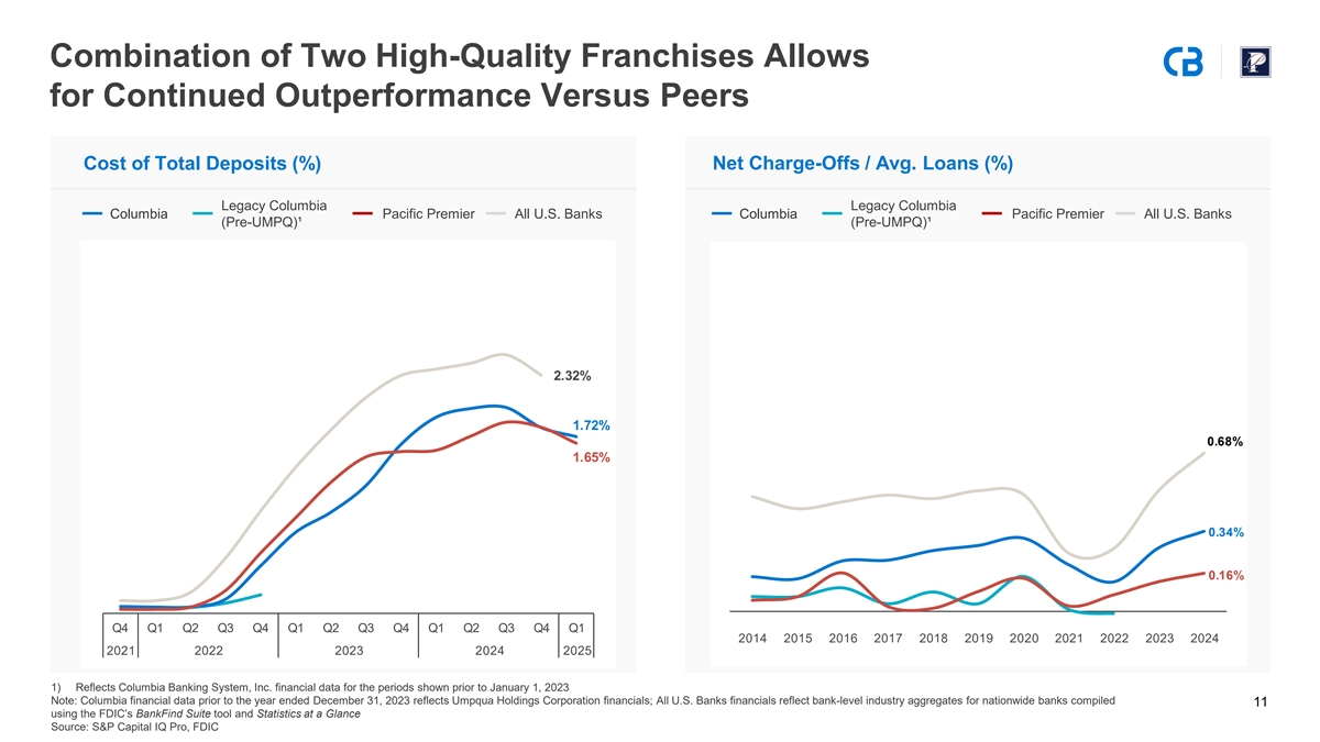 Complementary Commercial Lending Franchise Adding New Capabilities Unique Pacific Premier Capabilities Middle Market Banking HOA Banking ✓✓✓ ▪ Relationships in 38 states Small Business Banking ✓✓✓ ▪ Over 39k accounts across more than 17k HOAs Healthcare Banking ✓✓✓ ▪ Provides $2.6 billion of deposits with a WAIR of 0.80% Equipment Leasing & Finance ✓✓ International Banking ✓✓✓ Custodial Trust HOA Banking▪ Relationships in all 50 states ✓✓ ▪ Approximately $37 million of fee income generated in 2024 Insurance Solutions ✓✓ ▪ 31k accounts with an average account size of ~$592k Advanced Treasury Management ✓✓ ▪ Operations headquartered in Denver, Colorado Custodial Trust ✓✓ Wealth ✓✓ Escrow and 1031 Exchange ▪ Provides stable core deposits with 2.15% weighted-average cost in 1Q25 Mortgage Banking ✓✓ ▪ Total deposits of $378 million as of March 31, 2025 Retail Banking ✓✓✓ ▪ Approximately $3 million of fee income generated in 2024 Escrow and 1031 Exchange ✓✓ 10 Source: Company documents