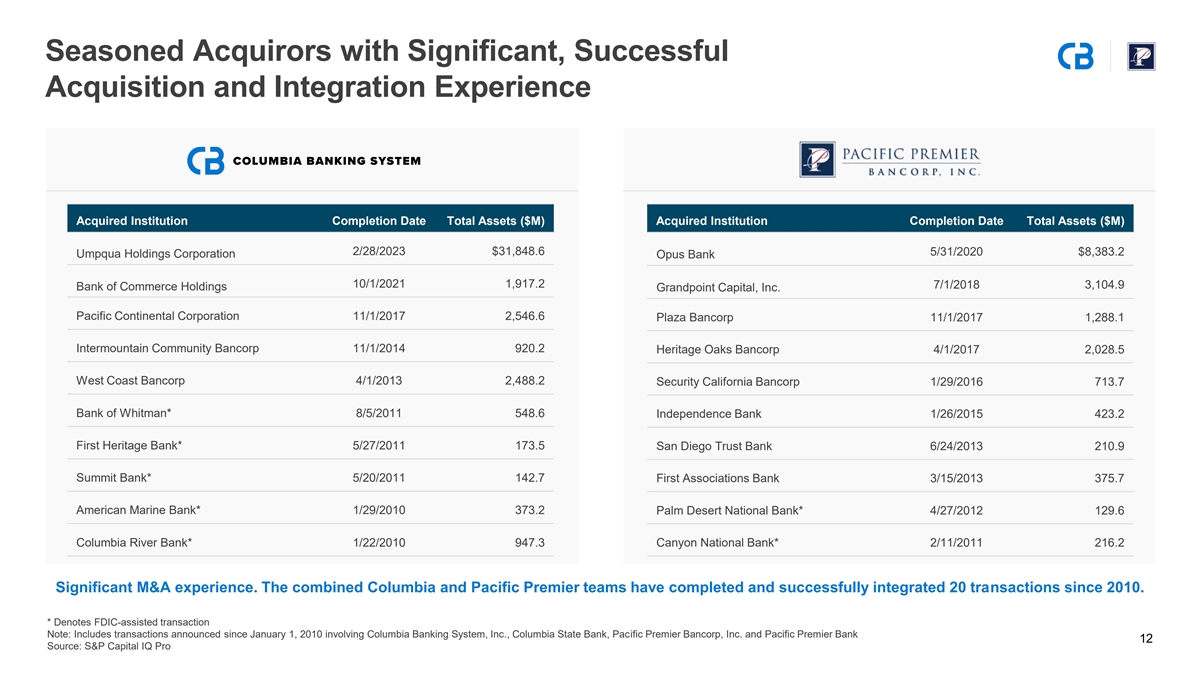 Combination of Two High-Quality Franchises Allows for Continued Outperformance Versus Peers Cost of Total Deposits (%) Net Charge-Offs / Avg. Loans (%) Legacy Columbia Legacy Columbia Columbia Pacific Premier All U.S. Banks Columbia Pacific Premier All U.S. Banks (Pre-UMPQ)¹ (Pre-UMPQ)¹ 4 1 2 3 4 1 2 3 4 1 2 3 4 1 2014 2015 201 201 201 201 2020 2021 2022 2023 2024 2021 2022 2023 2024 2025 1) Reflects Columbia Banking System, Inc. financial data for the periods shown prior to January 1, 2023 Note: Columbia financial data prior to the year ended December 31, 2023 reflects Umpqua Holdings Corporation financials; All U.S. Banks financials reflect bank-level industry aggregates for nationwide banks compiled 11 using the FDICB’sa nkFind Suite tool and Statistics at a Glance Source: S&P Capital IQ Pro, FDIC