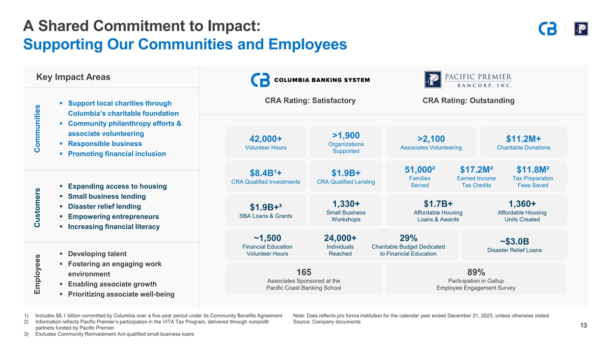 Seasoned Acquirors with Significant, Successful Acquisition and Integration Experience Acquired Institution Completion Date Total Assets ($M) Acquired Institution Completion Date Total Assets ($M) 2/28/2023 $31,848.6 5/31/2020 $8,383.2 Umpqua Holdings Corporation Opus Bank 10/1/2021 1,917.2 7/1/2018 3,104.9 Bank of Commerce Holdings Grandpoint Capital, Inc. Pacific Continental Corporation 11/1/2017 2,546.6 Plaza Bancorp 11/1/2017 1,288.1 Intermountain Community Bancorp 11/1/2014 920.2 Heritage Oaks Bancorp 4/1/2017 2,028.5 West Coast Bancorp 4/1/2013 2,488.2 Security California Bancorp 1/29/2016 713.7 Bank of Whitman* 8/5/2011 548.6 Independence Bank 1/26/2015 423.2 First Heritage Bank* 5/27/2011 173.5 San Diego Trust Bank 6/24/2013 210.9 Summit Bank* 5/20/2011 142.7 First Associations Bank 3/15/2013 375.7 American Marine Bank* 1/29/2010 373.2 Palm Desert National Bank* 4/27/2012 129.6 Columbia River Bank* 1/22/2010 947.3 Canyon National Bank* 2/11/2011 216.2 Significant M&A experience. The combined Columbia and Pacific Premier teams have completed and successfully integrated 20 transactions since 2010. * Denotes FDIC-assisted transaction Note: Includes transactions announced since January 1, 2010 involving Columbia Banking System, Inc., Columbia State Bank, Pacific Premier Bancorp, Inc. and Pacific Premier Bank 12 Source: S&P Capital IQ Pro