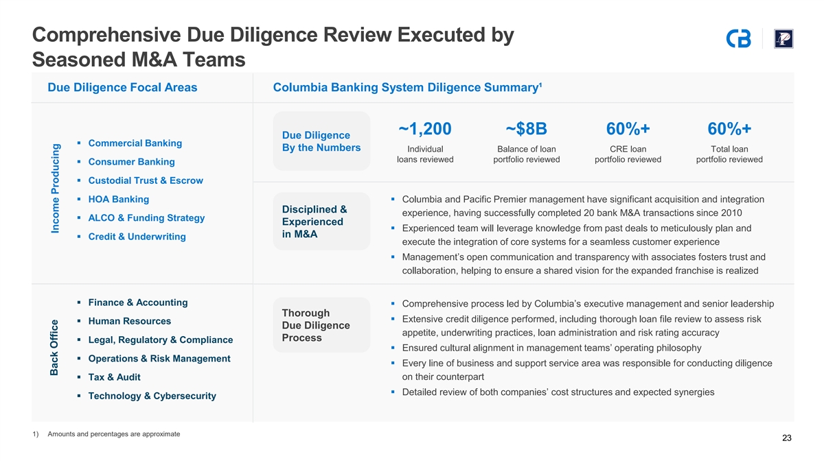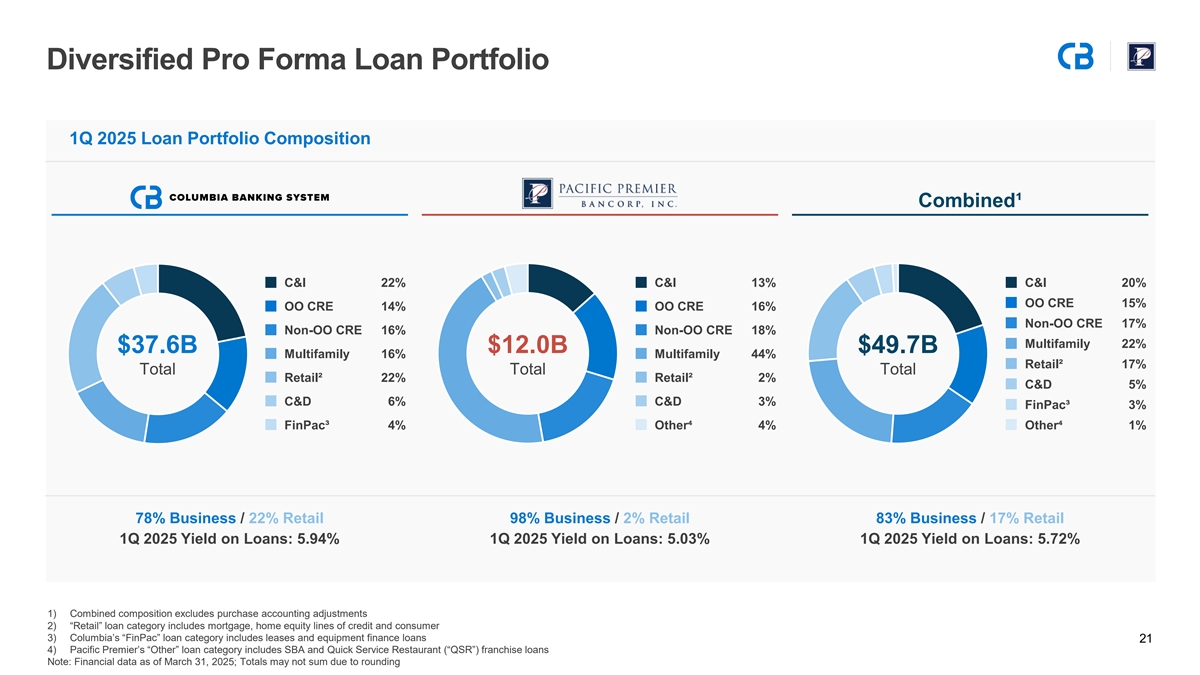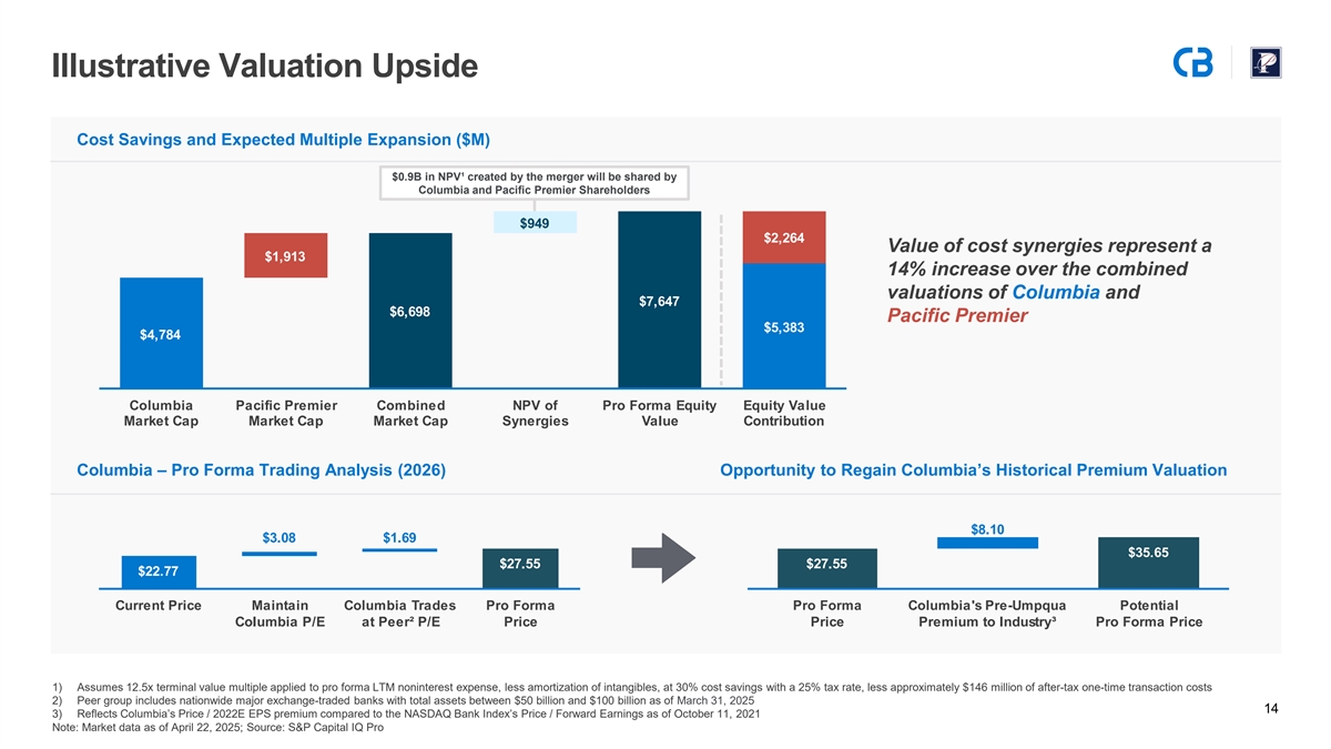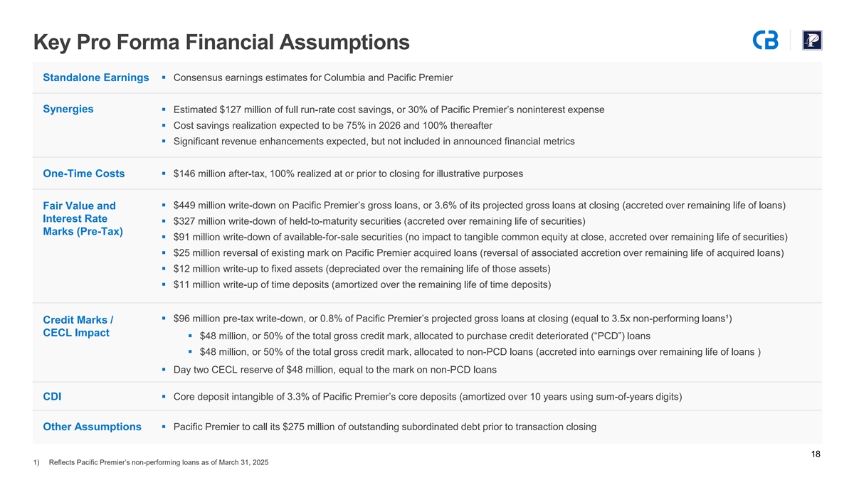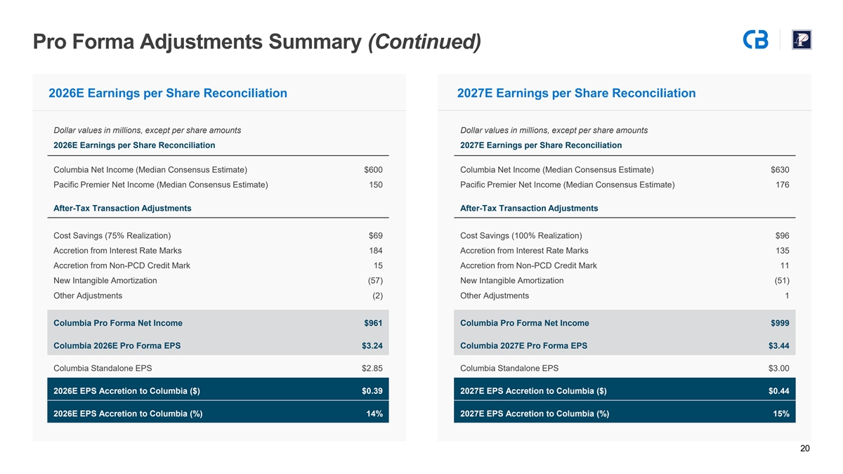 Pro Forma Adjustments Summary (Continued) 2026E Earnings per Share Reconciliation 2027E Earnings per Share Reconciliation Dollar values in millions, except per share amounts Dollar values in millions, except per share amounts 2026E Earnings per Share Reconciliation 2027E Earnings per Share Reconciliation Columbia Net Income (Median Consensus Estimate) $600 Columbia Net Income (Median Consensus Estimate) $630 Pacific Premier Net Income (Median Consensus Estimate) 150 Pacific Premier Net Income (Median Consensus Estimate) 176 After-Tax Transaction Adjustments After-Tax Transaction Adjustments Cost Savings (75% Realization) $69 Cost Savings (100% Realization) $96 Accretion from Interest Rate Marks 184 Accretion from Interest Rate Marks 135 Accretion from Non-PCD Credit Mark 15 Accretion from Non-PCD Credit Mark 11 New Intangible Amortization (57) New Intangible Amortization (51) Other Adjustments (2) Other Adjustments 1 Columbia Pro Forma Net Income $961 Columbia Pro Forma Net Income $999 Columbia 2026E Pro Forma EPS $3.24 Columbia 2027E Pro Forma EPS $3.44 Columbia Standalone EPS $2.85 Columbia Standalone EPS $3.00 2026E EPS Accretion to Columbia ($) $0.39 2027E EPS Accretion to Columbia ($) $0.44 2026E EPS Accretion to Columbia (%) 14% 2027E EPS Accretion to Columbia (%) 15% 20