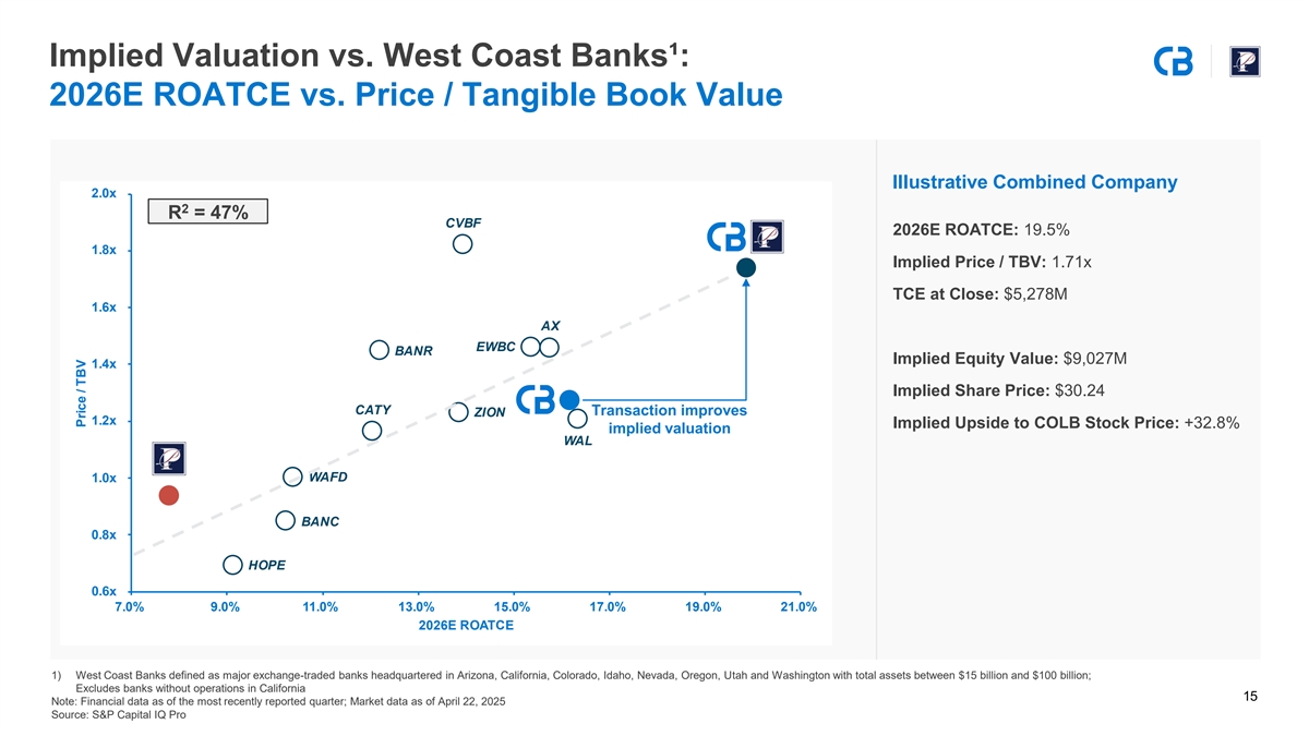 Illustrative Valuation Upside Cost Savings and Expected Multiple Expansion ($M) $0.9B in NPV¹ created by the merger will be shared by Columbia and Pacific Premier Shareholders Value of cost synergies represent a 14% increase over the combined valuations of Columbia and Pacific Premier Columbia a i i emie Combined V o o o ma uity uity Value a ket Cap a ket Cap a ket Cap Syne gies Value Cont ibution Columbia – Pro Forma Trading Analysis (2026) Oppo tunity to Regain Columbia’s Histo i al emium Valuation Cu ent i e aintain Columbia ades o o ma o o ma Columbia s e mp ua otential Columbia at ee i e i e emium to ndust y o o ma i e 1) Assumes 12.5x terminal value multiple applied to pro forma LTM noninterest expense, less amortization of intangibles, at 30% cost savings with a 25% tax rate, less approximately $146 million of after-tax one-time transaction costs 2) Peer group includes nationwide major exchange-traded banks with total assets between $50 billion and $100 billion as of March 31, 2025 14 3) Reflects Columbia’s Price / 2022E EPS premium compared to the NASDA Bank Index’s Price / Forward Earnings 202 as 1of October 11, Note: Market data as of April 22, 2025; Source: S&P Capital IQ Pro