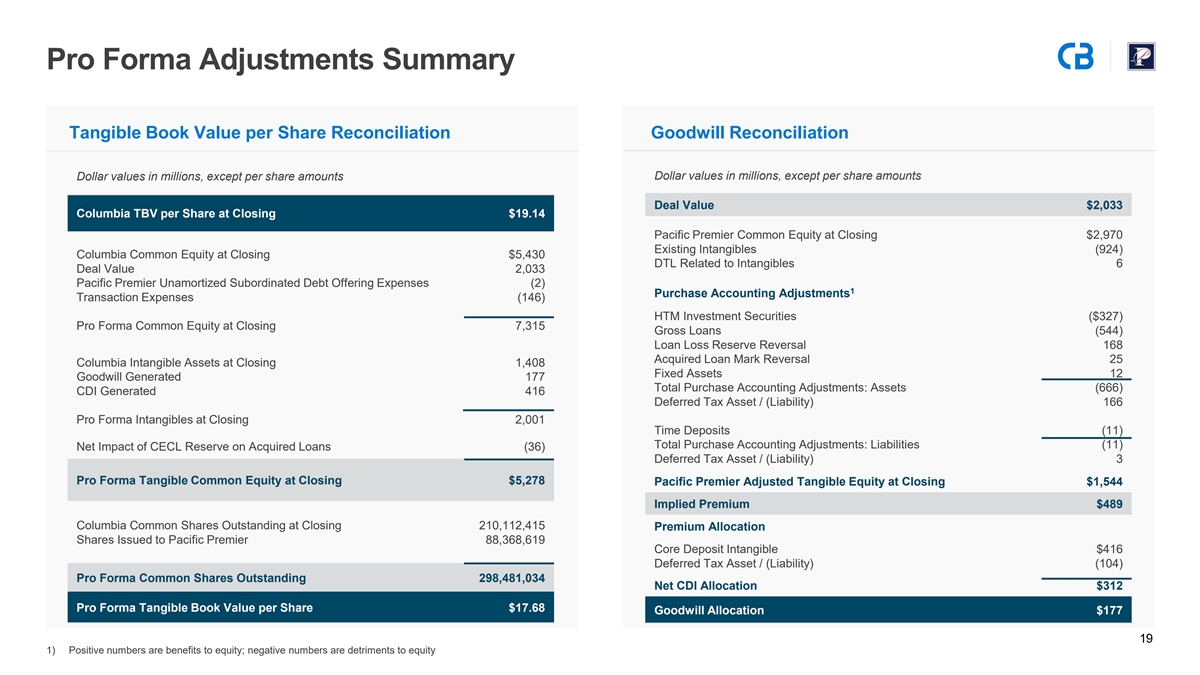 Key Pro Forma Financial Assumptions Standalone Earnings▪ Consensus earnings estimates for Columbia and Pacific Premier Synergies▪ Estimated $127 million of full run-rate cost savings, or 30% of Pacific Premier’s noninterest expense ▪ Cost savings realization expected to be 75% in 2026 and 100% thereafter ▪ Significant revenue enhancements expected, but not included in announced financial metrics One-Time Costs▪ $146 million after-tax, 100% realized at or prior to closing for illustrative purposes ▪ $449 million write-down on Pacific Premier’s gross loans, 3.6% or of its projected gross loans at closing (accreted over remaining life of loans) Fair Value and Interest Rate ▪ $327 million write-down of held-to-maturity securities (accreted over remaining life of securities) Marks (Pre-Tax) ▪ $91 million write-down of available-for-sale securities (no impact to tangible common equity at close, accreted over remaining life of securities) ▪ $25 million reversal of existing mark on Pacific Premier acquired loans (reversal of associated accretion over remaining life of acquired loans) ▪ $12 million write-up to fixed assets (depreciated over the remaining life of those assets) ▪ $11 million write-up of time deposits (amortized over the remaining life of time deposits) ▪ $96 million pre-tax write-down, or 0.8% of Pacific Premier’s projected gross loans at closing (equal -tpe o r3.5x form ing no ln oans¹) Credit Marks / CECL Impact ▪ $4 million, or 50% of the total gross credit mark, allocated to purchase credit deteriorated (“PCD”) loans ▪ $48 million, or 50% of the total gross credit mark, allocated to non-PCD loans (accreted into earnings over remaining life of loans ) ▪ Day two CECL reserve of $48 million, equal to the mark on non-PCD loans CDI▪ Core deposit intangible of 3.3% of Pacific Premier’s core deposits (amortized over 10 years -ofusi -yng ea rs sum digits) Other Assumptions▪ Pacific Premier to call its $275 million of outstanding subordinated debt prior to transaction closing 18 1) Reflects Pacific Premier’s n -poenrforming loans as of March 31, 2025