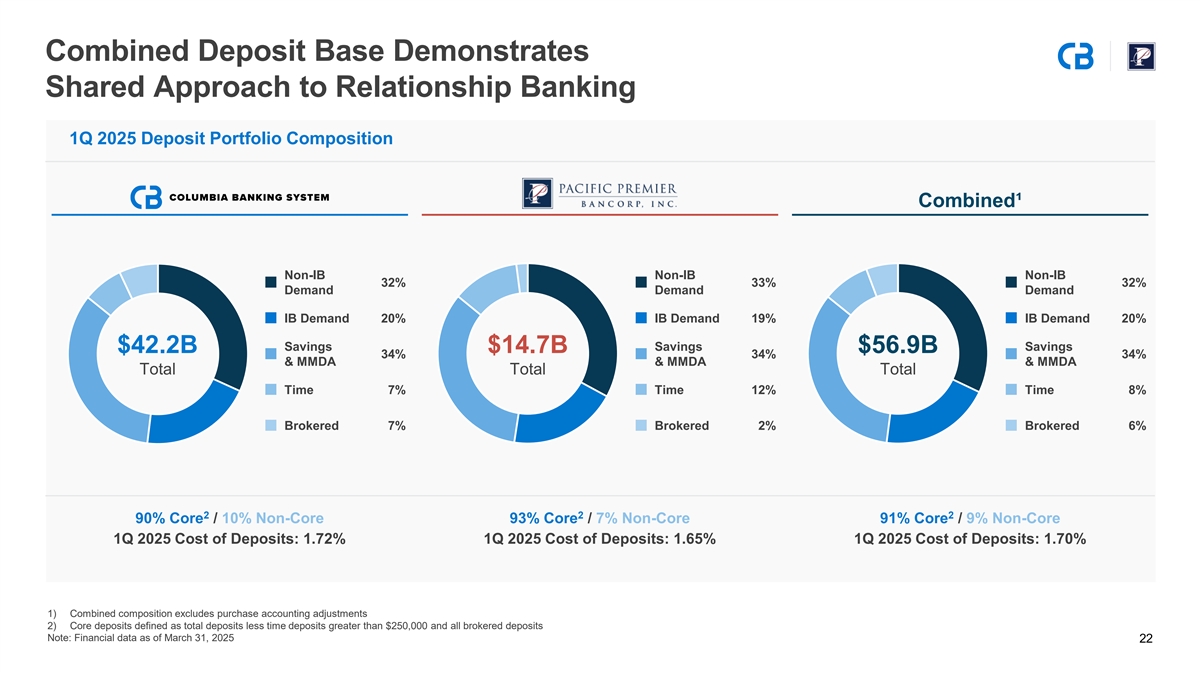 Diversified Pro Forma Loan Portfolio 1Q 2025 Loan Portfolio Composition Combined¹ C&I 22% C&I 13% C&I 20% OO CRE 15% OO CRE 14% OO CRE 16% Non-OO CRE 17% Non-OO CRE 16% Non-OO CRE 18% Multifamily 22% $37.6B $12.0B $49.7B Multifamily 16% Multifamily 44% Retail² 17% Total Total Total Retail² 22% Retail² 2% C&D 5% C&D 6% C&D 3% FinPac³ 3% FinPac³ 4% Othe ⁴ 4% Othe ⁴ 1% 78% Business / 22% Retail 98% Business / 2% Retail 83% Business / 17% Retail 1Q 2025 Yield on Loans: 5.94% 1Q 2025 Yield on Loans: 5.03% 1Q 2025 Yield on Loans: 5.72% 1) Combined composition excludes purchase accounting adjustments 2) “Retail” loan category includes mortgage, home equity lines of credit and consumer 3) Columbia’s FinP “ ac” loan category includes leases and equipment finance loans 21 4) Pacific Premier’s “Other” loan category includes SBA and uick Service Restaurant (“ SR”) franchise loans Note: Financial data as of March 31, 2025; Totals may not sum due to rounding