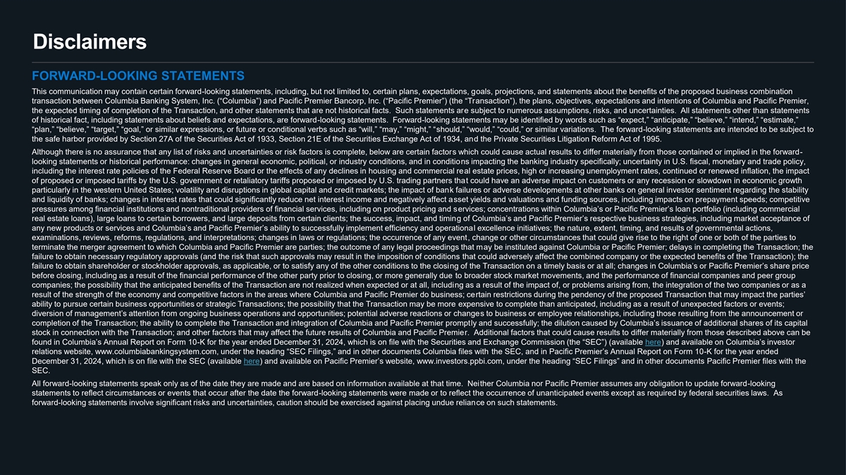 Disclaimers FORWARD-LOOKING STATEMENTS This communication may contain certain forward-looking statements, including, but not limited to, certain plans, expectations, goals, projections, and statements about the benefits of the proposed business combination transaction between Columbia Banking System, Inc. (“Columbia”) and Pacific Premier Bancorp, Inc. (“Pacific Pre ans miear”) ctio(th n”), e th“Ter plans, objectives, expectations and intentions of Columbia and Pacific Premier, the expected timing of completion of the Transaction, and other statements that are not historical facts. Such statements are subject to numerous assumptions, risks, and uncertainties. All statements other than statements of historical fact, including statements about beliefs and expectations, are forward-looking statements. Forward-looking statements may be identified by words such as “expect,” “anticipate,” “believe,” “intend,” “estimate,” “plan,” “believe,” “target,” “goal,” or similar expressions, or future or conditional verbs such as “will,” s“m hoauyld,” ,” “m“wigohut,ld” ,” ““could,” or similar variations. The f -loo orw kinagrd statements are intended to be subject to the safe harbor provided by Section 27A of the Securities Act of 1933, Section 21E of the Securities Exchange Act of 1934, and the Private Securities Litigation Reform Act of 1995. Although there is no assurance that any list of risks and uncertainties or risk factors is complete, below are certain factors which could cause actual results to differ materially from those contained or implied in the forward- looking statements or historical performance: changes in general economic, political, or industry conditions, and in conditions impacting the banking industry specifically; uncertainty in U.S. fiscal, monetary and trade policy, including the interest rate policies of the Federal Reserve Board or the effects of any declines in housing and commercial real estate prices, high or increasing unemployment rates, continued or renewed inflation, the impact of proposed or imposed tariffs by the U.S. government or retaliatory tariffs proposed or imposed by U.S. trading partners that could have an adverse impact on customers or any recession or slowdown in economic growth particularly in the western United States; volatility and disruptions in global capital and credit markets; the impact of bank failures or adverse developments at other banks on general investor sentiment regarding the stability and liquidity of banks; changes in interest rates that could significantly reduce net interest income and negatively affect asset yields and valuations and funding sources, including impacts on prepayment speeds; competitive pressures among financial institutions and nontraditional providers of financial services, including on product pricing and services; concentrations within Columbia’s or Pacific Premier’s loan portfolio (including commercial real estate loans), large loans to certain borrowers, and large deposits from certain clients; the success, impact, and timing of Columbia’s and Pacific Premier’s respective business strategies, including market acceptance of any new products or services and Columbia’s and Pacific Premier’s ability to successfully implement efficiency l eaxn cd e lleonpceera intio itin aa tives; the nature, extent, timing, and results of governmental actions, examinations, reviews, reforms, regulations, and interpretations; changes in laws or regulations; the occurrence of any event, change or other circumstances that could give rise to the right of one or both of the parties to terminate the merger agreement to which Columbia and Pacific Premier are parties; the outcome of any legal proceedings that may be instituted against Columbia or Pacific Premier; delays in completing the Transaction; the failure to obtain necessary regulatory approvals (and the risk that such approvals may result in the imposition of conditions that could adversely affect the combined company or the expected benefits of the Transaction); the failure to obtain shareholder or stockholder approvals, as applicable, or to satisfy any of the other conditions to the closing of the Transaction on a timely basis or at all; changes in Columbia’s or Pacific Premier’s share price before closing, including as a result of the financial performance of the other party prior to closing, or more generally due to broader stock market movements, and the performance of financial companies and peer group companies; the possibility that the anticipated benefits of the Transaction are not realized when expected or at all, including as a result of the impact of, or problems arising from, the integration of the two companies or as a result of the strength of the economy and competitive factors in the areas where Columbia and Pacific Premier do business; certain restrictions during the pendency of the proposed Transaction that may impact the parties’ ability to pursue certain business opportunities or strategic Transactions; the possibility that the Transaction may be more expensive to complete than anticipated, including as a result of unexpected factors or events; diversion of management’s attention from ongoing business operations and opportunities; potential adverse reaction s s to bu or sic neha sng s or e employee relationships, including those resulting from the announcement or completion of the Transaction; the ability to complete the Transaction and integration of Columbia and Pacific Premier promptly and successfully; the dilution caused by Columbia’s issuance of additional shares of its capital stock in connection with the Transaction; and other factors that may affect the future results of Columbia and Pacific Premier. Additional factors that could cause results to differ materially from those described above can be found in Columbia’s Annual Report on Fo -K rm fo r t10 he year en
