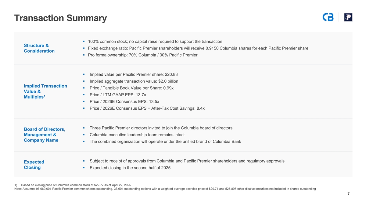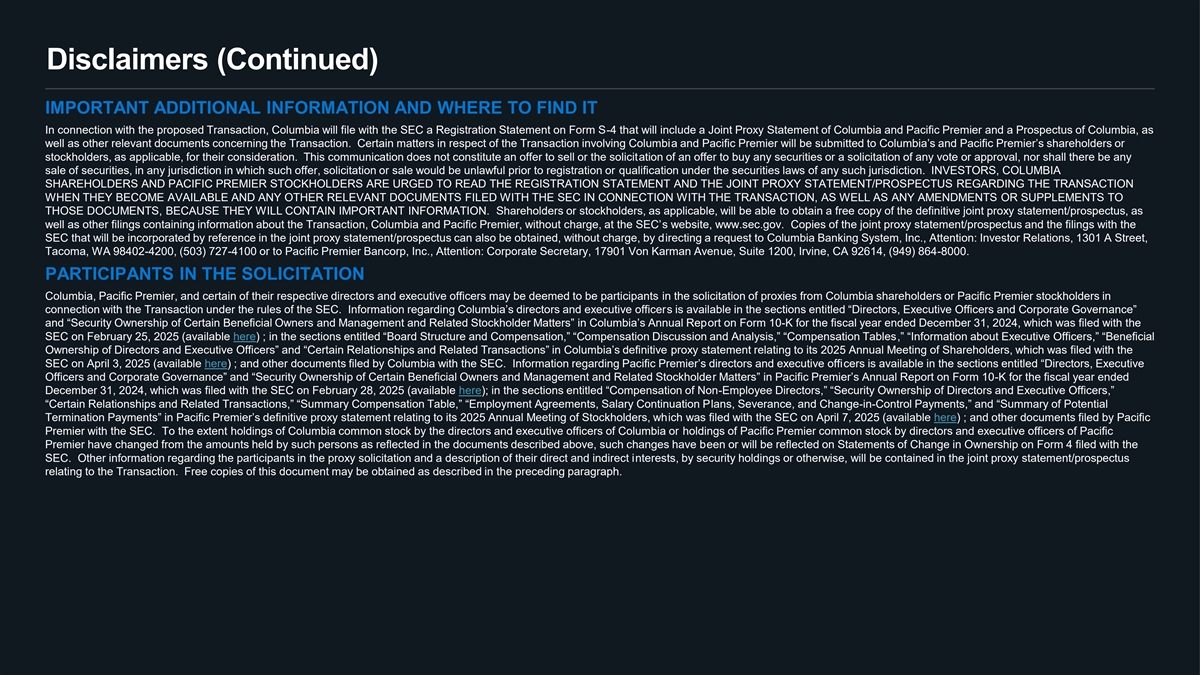Disclaimers (Continued) IMPORTANT ADDITIONAL INFORMATION AND WHERE TO FIND IT In connection with the proposed Transaction, Columbia will file with the SEC a Registration Statement on Form S-4 that will include a Joint Proxy Statement of Columbia and Pacific Premier and a Prospectus of Columbia, as well as other relevant documents concerning the Transaction. Certain matters in respect of the Transaction involving Columbia and Pacific Premier will be submitted to Columbia’s and Pacific Premier’s shareholders or stockholders, as applicable, for their consideration. This communication does not constitute an offer to sell or the solicitation of an offer to buy any securities or a solicitation of any vote or approval, nor shall there be any sale of securities, in any jurisdiction in which such offer, solicitation or sale would be unlawful prior to registration or qualification under the securities laws of any such jurisdiction. INVESTORS, COLUMBIA SHAREHOLDERS AND PACIFIC PREMIER STOCKHOLDERS ARE URGED TO READ THE REGISTRATION STATEMENT AND THE JOINT PROXY STATEMENT/PROSPECTUS REGARDING THE TRANSACTION WHEN THEY BECOME AVAILABLE AND ANY OTHER RELEVANT DOCUMENTS FILED WITH THE SEC IN CONNECTION WITH THE TRANSACTION, AS WELL AS ANY AMENDMENTS OR SUPPLEMENTS TO THOSE DOCUMENTS, BECAUSE THEY WILL CONTAIN IMPORTANT INFORMATION. Shareholders or stockholders, as applicable, will be able to obtain a free copy of the definitive joint proxy statement/prospectus, as well as other filings containing information about the Transaction, Columbia and Pacific Premier, without charg s we, eba st iteth , we wwSEC’ .sec.gov. Copies of the joint proxy statement/prospectus and the filings with the SEC that will be incorporated by reference in the joint proxy statement/prospectus can also be obtained, without charge, by directing a request to Columbia Banking System, Inc., Attention: Investor Relations, 1301 A Street, Tacoma, WA 98402-4200, (503) 727-4100 or to Pacific Premier Bancorp, Inc., Attention: Corporate Secretary, 17901 Von Karman Avenue, Suite 1200, Irvine, CA 92614, (949) 864-8000. PARTICIPANTS IN THE SOLICITATION Columbia, Pacific Premier, and certain of their respective directors and executive officers may be deemed to be participants in the solicitation of proxies from Columbia shareholders or Pacific Premier stockholders in connection with the Transaction under the rules of the SEC. Information regarding Columbia’s directors and s e isx eacuvativilaeb o le ffiicne rthe sections entitled “Directors, Executive Officers and Corporate Governance” and “Security Ownership of Certain Beneficial Owners and Management and Related Stockholder Matters” in Columbioart’so nAn Fonu rmal 10Rep -K for the fiscal year ended December 31, 2024, which was filed with the SEC on February 25, 2025 (available here) ; in the sections entitled “Board Structure and Compensation,” “Compensation Discussion and Analysis,” “Compe,” n“In safo tiorm n aTtiaobnl esabout Executive Officers,” “Beneficial Ownership of Directors and Executive Officers” and “Certain Relationships and Related Transactions” in Columb piroa’xsy d sta efitenimtiv ee n t relating to its 2025 Annual Meeting of Shareholders, which was filed with the SEC on April 3, 2025 (available here) ; and other documents filed by Columbia with the SEC. Information regarding Pacific Premier’s directors cearnsd ise xeacvuatiilaveb o le ffini the sections entitled “Directors, Executive Officers and Corporate Governance” and “Security Ownership of Certain Beneficial Owners and Management and Rela r te Mda ttSto ers” i ckhno ldPa ecific Premier’s Annual Report on Fo -K rm fo r th10 e fiscal year ended December 31, 2024, which was filed with the SEC on February 28, 2025 (available here); in the sections entitled “Compensation -oEm f Non ployee Directors,” “Security Ownership of Directors and Executive Officers,” “Certain Relationships and Related Transactions,” “Summary Compensation Table,” “Employment Agreements, Salary Con lantin su , a Setio vn e raP nce, and Change-in-Control Payments,” and “Summary of Potential Termination Payments” in Pacific Premier’s definitive proxy statement relating to its 2025 Annual Meeting of Sto ichcwkahso fld ile ers d , wiw thh the SEC on April 7, 2025 (available here) ; and other documents filed by Pacific Premier with the SEC. To the extent holdings of Columbia common stock by the directors and executive officers of Columbia or holdings of Pacific Premier common stock by directors and executive officers of Pacific Premier have changed from the amounts held by such persons as reflected in the documents described above, such changes have been or will be reflected on Statements of Change in Ownership on Form 4 filed with the SEC. Other information regarding the participants in the proxy solicitation and a description of their direct and indirect interests, by security holdings or otherwise, will be contained in the joint proxy statement/prospectus relating to the Transaction. Free copies of this document may be obtained as described in the preceding paragraph.