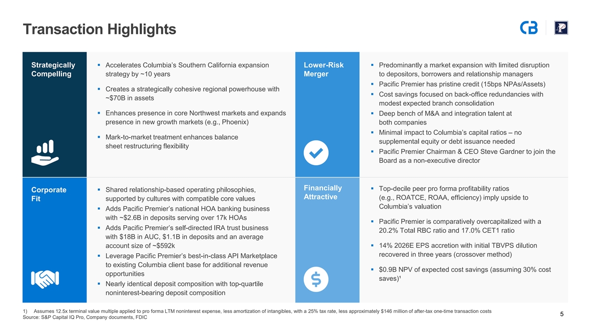 Expanding the Premier Business Bank in the West Increased Scale: Pro Forma Snapshot Scale in Southern California and Increased Presence in the Northwest $70B $51B $57B Assets Loans Deposits Seattle Strong Financials: Top-Tier Profitability and Fortress Balance Sheet ~14% 3 Years 2026E EPS Accretion TBVPS Earnback ~1.4% ~20% ~11% Pro Forma Pro Forma Pro Forma CET1 2026E ROAA 2026E ROATCE Ratio @ Close 1 Top Western-Region Headquartered Banks by Assets Los Angeles B B B B B B B B B B B Columbia (296) Pacific Premier (58) 1) Includes the 10 largest publicly traded banks headquartered in Arizona, California, Colorado, Idaho, 2) Mechanics Bank total assets shown pro forma for pending acquisition of HomeStreet, Inc. 4 Nevada, Oregon, Utah and Washington with total assets less than $250 billion as of the most recently Note: Financial data as of the most recently reported quarter reported quarter Source: S&P Capital IQ Pro, Company documents