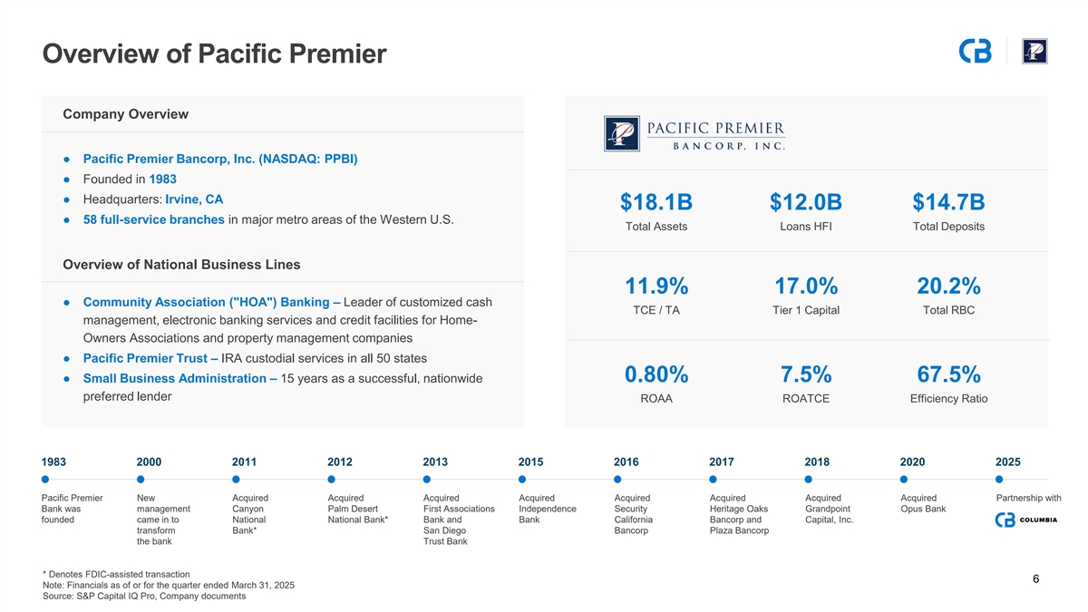 Transaction Highlights Strategically ▪ Accelerates Columbia’s Southern California expansion Lower-Risk ▪ Predominantly a market expansion with limited disruption Compelling strategy by ~10 years Merger to depositors, borrowers and relationship managers ▪ Pacific Premier has pristine credit (15bps NPAs/Assets) ▪ Creates a strategically cohesive regional powerhouse with ▪ Cost savings focused on back-office redundancies with ~$70B in assets modest expected branch consolidation ▪ Enhances presence in core Northwest markets and expands ▪ Deep bench of M&A and integration talent at presence in new growth markets (e.g., Phoenix) both companies ▪ Minimal impact to Columbia’s capital r–atio no s ▪ Mark-to-market treatment enhances balance supplemental equity or debt issuance needed sheet restructuring flexibility ▪ Pacific Premier Chairman & CEO Steve Gardner to join the Board as a non-executive director Financially ▪ Top-decile peer pro forma profitability ratios ▪ Shared relationship-based operating philosophies, Corporate Attractive (e.g., ROATCE, ROAA, efficiency) imply upside to Fit supported by cultures with compatible core values Columbia’s valuation ▪ Adds Pacific Premier’s national HOA banking business with ~$2.6B in deposits serving over 17k HOAs ▪ Pacific Premier is comparatively overcapitalized with a ▪ Adds Pacific Premier’s sel -dirfected IRA trust business 20.2% Total RBC ratio and 17.0% CET1 ratio with $18B in AUC, $1.1B in deposits and an average ▪ 14% 2026E EPS accretion with initial TBVPS dilution account size of ~$592k recovered in three years (crossover method) ▪ Leverage Pacific Premier’s best -in-class API Marketplace to existing Columbia client base for additional revenue ▪ $0.9B NPV of expected cost savings (assuming 30% cost opportunities saves)¹ ▪ Nearly identical deposit composition with top-quartile noninterest-bearing deposit composition 1) Assumes 12.5x terminal value multiple applied to pro forma LTM noninterest expense, less amortization of intangibles, with a 25% tax rate, less approximately $146 million of after-tax one-time transaction costs 5 Source: S&P Capital IQ Pro, Company documents, FDIC