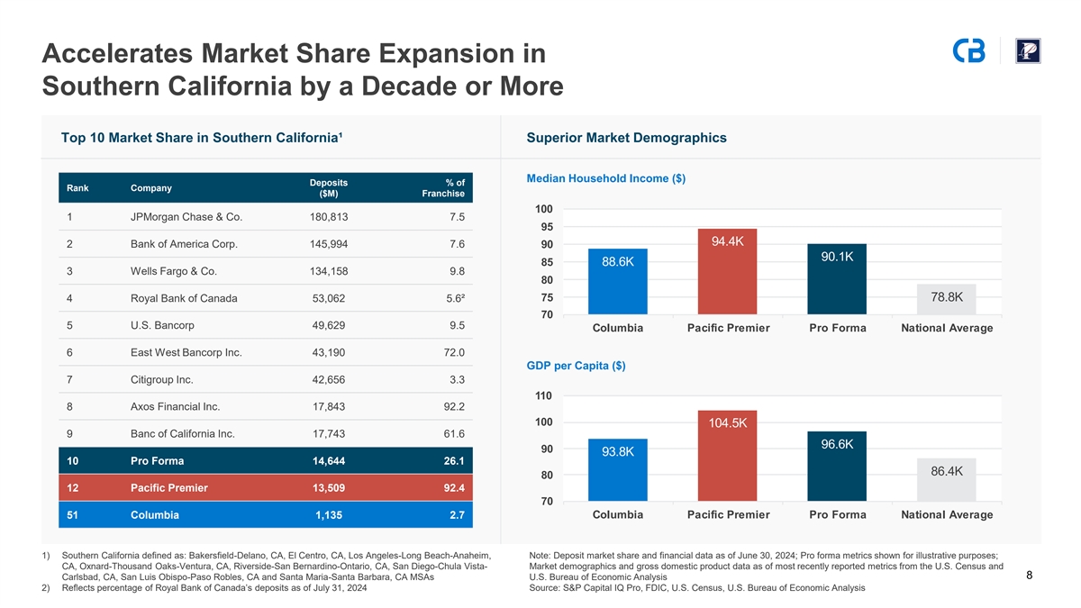 Accelerates Market Share Expansion in Southern California by a Decade or More Top 10 Market Share in Southern California¹ Superior Market Demographics Median Household Income ($) Deposits % of Rank Company ($M) Franchise 1 JPMorgan Chase & Co. 180,813 7.5 4.4 2 Bank of America Corp. 145,994 7.6 0.1 . 3 Wells Fargo & Co. 134,158 9.8 4 Royal Bank of Canada 53,062 5.6² . 5 U.S. Bancorp 49,629 9.5 Columbia a i i emie o o ma ational e age 6 East West Bancorp Inc. 43,190 72.0 GDP per Capita ($) 7 Citigroup Inc. 42,656 3.3 8 Axos Financial Inc. 17,843 92.2 104.5 9 Banc of California Inc. 17,743 61.6 . 3. 10 Pro Forma 14,644 26.1 .4 12 Pacific Premier 13,509 92.4 51 Columbia 1,135 2.7 Columbia a i i emie o o ma ational e age 1) Southern California defined as: Bakersfield-Delano, CA, El Centro, CA, Los Angeles-Long Beach-Anaheim, Note: Deposit market share and financial data as of June 30, 2024; Pro forma metrics shown for illustrative purposes; CA, Oxnard-Thousand Oaks-Ventura, CA, Riverside-San Bernardino-Ontario, CA, San Diego-Chula Vista- Market demographics and gross domestic product data as of most recently reported metrics from the U.S. Census and 8 Carlsbad, CA, San Luis Obispo-Paso Robles, CA and Santa Maria-Santa Barbara, CA MSAs U.S. Bureau of Economic Analysis 2) Reflects percentage of Royal Bank of Canada’s deposits as of July 31, 2024 Source: S&P Capital IQ Pro, FDIC, U.S. Census, U.S. Bureau of Economic Analysis