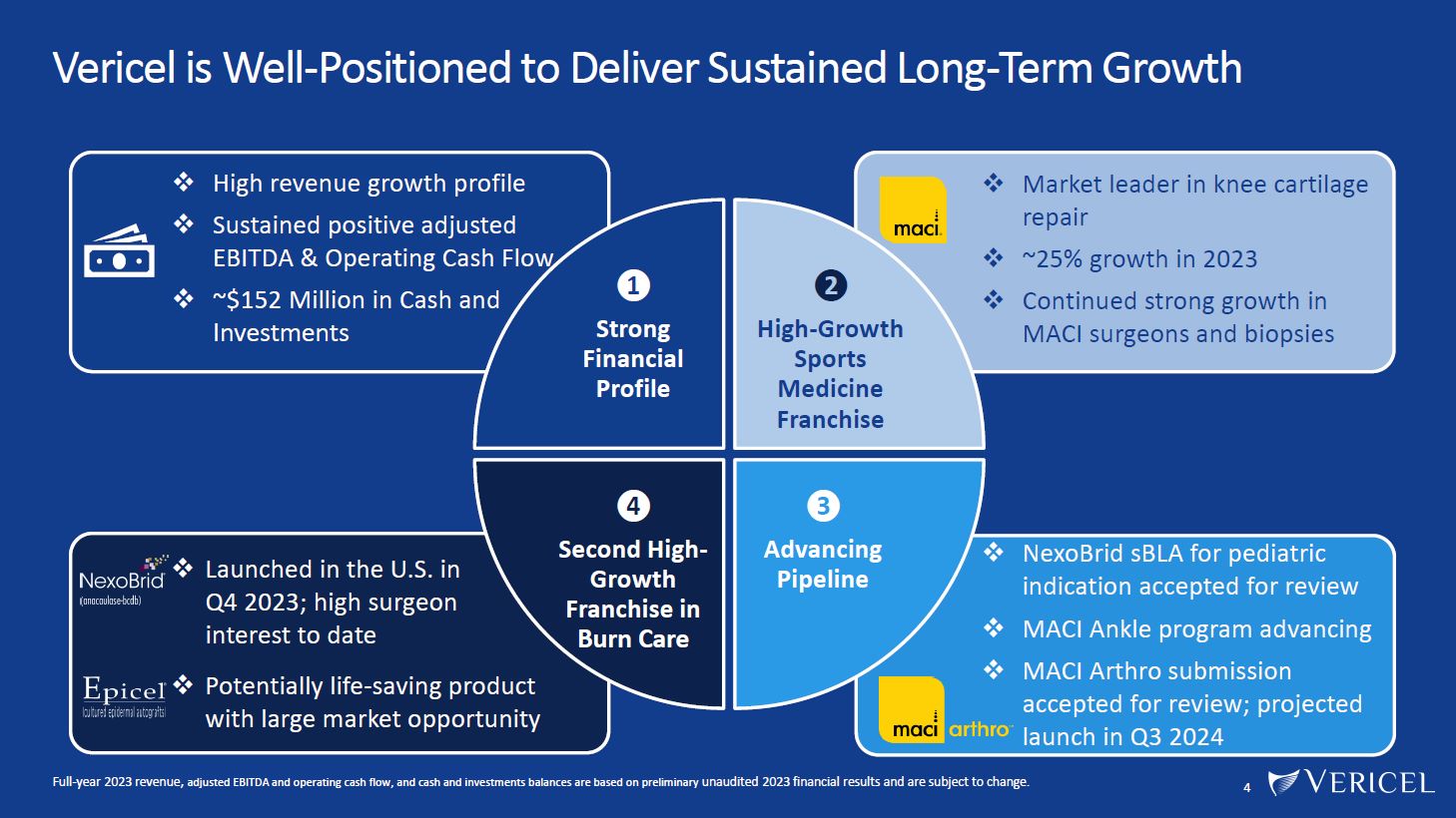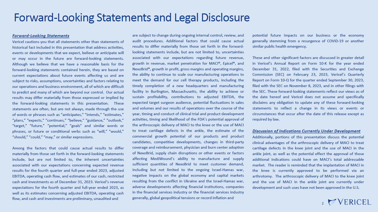 Forward-Looking Statements and Legal Disclosure  2  Forward-Looking Statements  Vericel cautions you that all statements other than statements of historical fact included in this presentation that address activities, events or developments that we expect, believe or anticipate will or may occur in the future are forward-looking statements. Although we believe that we have a reasonable basis for the forward-looking statements contained herein, they are based on current expectations about future events affecting us and are subject to risks, assumptions, uncertainties and factors relating to our operations and business environment, all of which are difficult to predict and many of which are beyond our control. Our actual results may differ materially from those expressed or implied by the forward-looking statements in this presentation. These statements are often, but are not always, made through the use of words or phrases such as “anticipates,” “intends,” “estimates,” “plans,” “expects,” “continues,” “believe,” “guidance,” “outlook,” “target,” “future,” “potential,” “goals” and similar words or phrases, or future or conditional verbs such as “will,” “would,” “should,” “could,” “may,” or similar expressions.  Among the factors that could cause actual results to differ materially from those set forth in the forward-looking statements include, but are not limited to, the inherent uncertainties associated with our expectations concerning expected revenue results for the fourth quarter and full-year ended 2023, adjusted EBITDA, operating cash flow, and estimates of our cash, restricted cash and investments as of December 31, 2023. Vericel’s revenue expectations for the fourth quarter and full-year ended 2023, as well as its estimates concerning adjusted EBITDA, operating cash flow, and cash and investments are preliminary, unaudited and  are subject to change during ongoing internal control, review, and audit procedures. Additional factors that could cause actual results to differ materially from those set forth in the forward- looking statements include, but are not limited to, uncertainties associated with our expectations regarding future revenue, growth in revenue, market penetration for MACI®, Epicel®, and NexoBrid®, growth in profit, gross margins and operating margins, the ability to continue to scale our manufacturing operations to meet the demand for our cell therapy products, including the timely completion of a new headquarters and manufacturing facility in Burlington, Massachusetts, the ability to achieve or sustain profitability, contributions to adjusted EBITDA, the expected target surgeon audience, potential fluctuations in sales and volumes and our results of operations over the course of the year, timing and conduct of clinical trial and product development activities, timing and likelihood of the FDA’s potential approval of the arthroscopic delivery of MACI to the knee or the use of MACI to treat cartilage defects in the ankle, the estimate of the commercial growth potential of our products and product candidates, competitive developments, changes in third-party coverage and reimbursement, physician and burn center adoption of NexoBrid, supply chain disruptions or other events or factors affecting MediWound’s ability to manufacture and supply sufficient quantities of NexoBrid to meet customer demand, including but not limited to the ongoing Israel-Hamas war, negative impacts on the global economy and capital markets resulting from the conflict in Ukraine and the Israel-Hamas war, adverse developments affecting financial institutions, companies in the financial services industry or the financial services industry generally, global geopolitical tensions or record inflation and  potential future impacts on our business or the economy generally stemming from a resurgence of COVID-19 or another similar public health emergency.  These and other significant factors are discussed in greater detail in Vericel’s Annual Report on Form 10-K for the year ended December 31, 2022, filed with the Securities and Exchange Commission (SEC) on February 23, 2023, Vericel’s Quarterly Report on Form 10-Q for the quarter ended September 30, 2023, filed with the SEC on November 8, 2023, and in other filings with the SEC. These forward-looking statements reflect our views as of the date hereof and Vericel does not assume and specifically disclaims any obligation to update any of these forward-looking statements to reflect a change in its views or events or circumstances that occur after the date of this release except as required by law.  Discussion of Indications Currently Under Development Additionally, portions of this presentation discuss the potential clinical advantages of the arthroscopic delivery of MACI to treat cartilage defects in the knee joint and the use of MACI in the ankle joint, as well as the potential effect the approval of those additional indications could have on MACI’s total addressable market. The reader is reminded that the implantation of MACI in the knee is currently approved to be performed via an arthrotomy. The arthroscopic delivery of MACI to the knee joint and the use of MACI in the ankle joint are currently under development and such uses have not been approved in the U.S.
