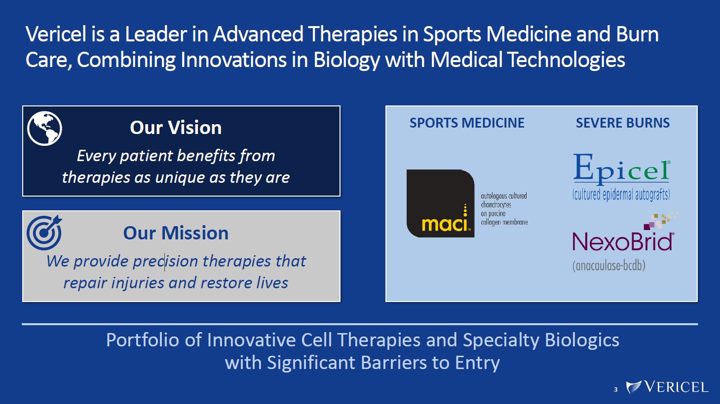 Vericel is a Leader in Advanced Therapies in Sports Medicine and Burn Care, Combining Innovations in Biology with Medical Technologies  Our Vision  Every patient benefits from therapies as unique as they are  Our Mission  We provide precision therapies that repair injuries and restore lives  SPORTS MEDICINE SEVERE BURNS  Portfolio of Innovative Cell Therapies and Specialty Biologics with Significant Barriers to Entry  3