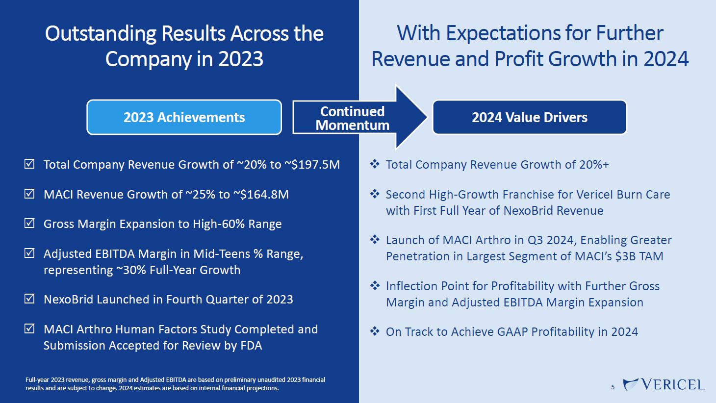 ❶  Strong Financial Profile  ❷  High-Growth Sports Medicine Franchise  ❸  Advancing Pipeline  ❹  Second High- Growth Franchise in Burn Care  Market leader in knee cartilage repair  ~25% growth in 2023  Continued strong growth in MACI surgeons and biopsies  High revenue growth profile  Sustained positive adjusted EBITDA & Operating Cash Flow  ~$152 Million in Cash and  Investments  NexoBrid sBLA for pediatric indication accepted for review  MACI Ankle program advancing  MACI Arthro submission accepted for review; projected launch in Q3 2024  4  Vericel is Well-Positioned to Deliver Sustained Long-Term Growth  Launched in the U.S. in Q4 2023; high surgeon interest to date  Potentially life-saving product with large market opportunity  Full-year 2023 revenue, adjusted EBITDA and operating cash flow, and cash and investments balances are based on preliminary unaudited 2023 financial results and are subject to change.