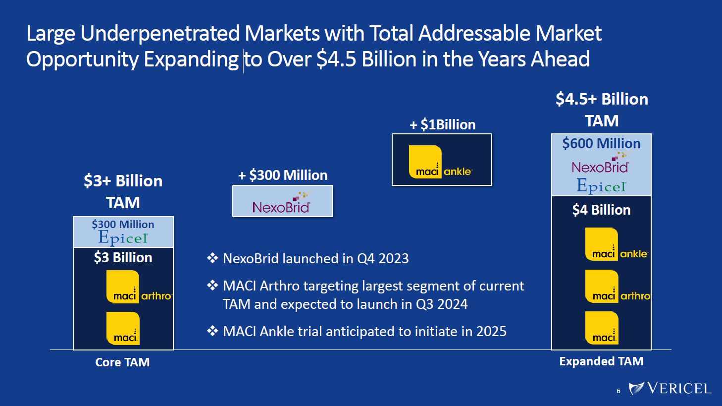  MACI Revenue Growth of ~25% to ~$164.8M   Gross Margin Expansion to High-60% Range   Adjusted EBITDA Margin in Mid-Teens % Range, representing ~30% Full-Year Growth   NexoBrid Launched in Fourth Quarter of 2023   MACI Arthro Human Factors Study Completed and Submission Accepted for Review by FDA   Total Company Revenue Growth of ~20% to ~$197.5M  Total Company Revenue Growth of 20%+  Second High-Growth Franchise for Vericel Burn Care  with First Full Year of NexoBrid Revenue  Launch of MACI Arthro in Q3 2024, Enabling Greater  Penetration in Largest Segment of MACI’s $3B TAM  Inflection Point for Profitability with Further Gross  Margin and Adjusted EBITDA Margin Expansion  On Track to Achieve GAAP Profitability in 2024  Outstanding Results Across the Company in 2023  5  Continued  Momentum  2023 Achievements  2024 Value Drivers  With Expectations for Further Revenue and Profit Growth in 2024  Full-year 2023 revenue, gross margin and Adjusted EBITDA are based on preliminary unaudited 2023 financial  results and are subject to change. 2024 estimates are based on internal financial projections.