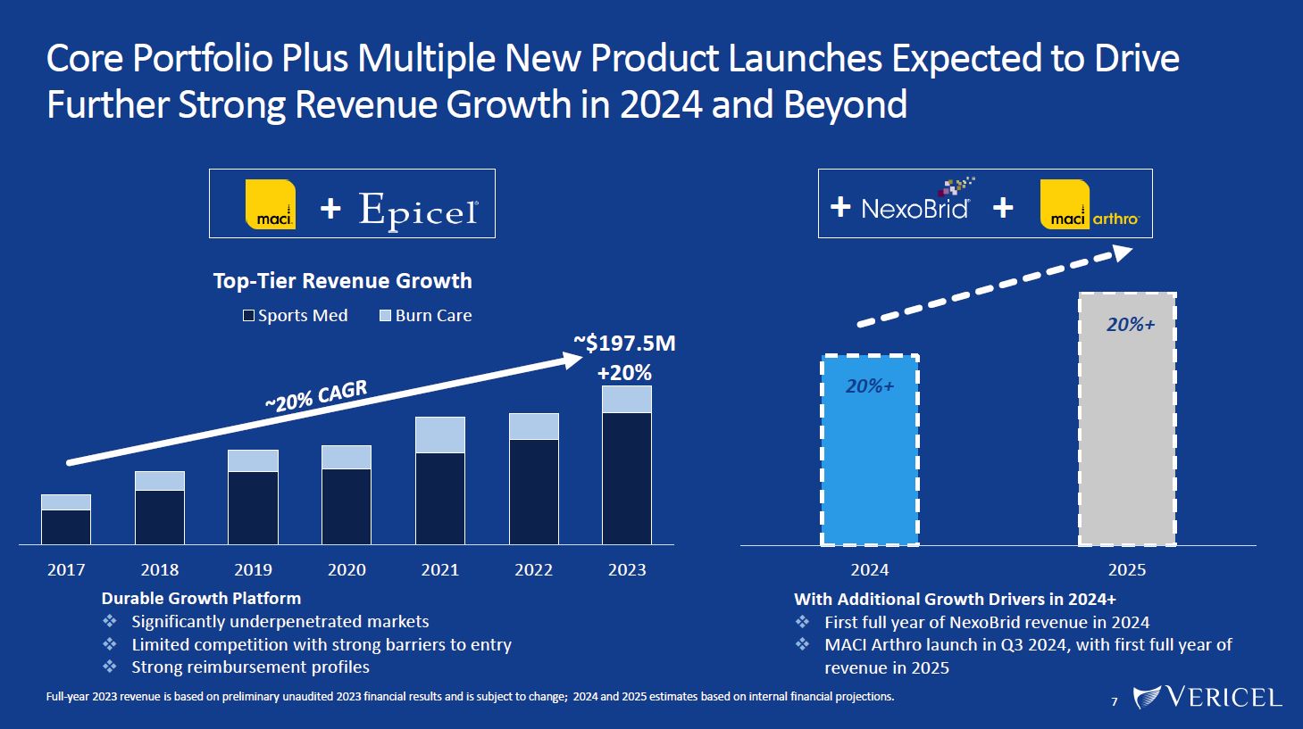 Large Underpenetrated Markets with Total Addressable Market Opportunity Expanding to Over $4.5 Billion in the Years Ahead  6  $3 Billion  + $300 Million  + $1Billion  $4 Billion  $600 Million  Core TAM  Expanded TAM  NexoBrid launched in Q4 2023  MACI Arthro targeting largest segment of current TAM and expected to launch in Q3 2024  MACI Ankle trial anticipated to initiate in 2025  $3+ Billion  TAM  $4.5+ Billion  TAM  $300 Million