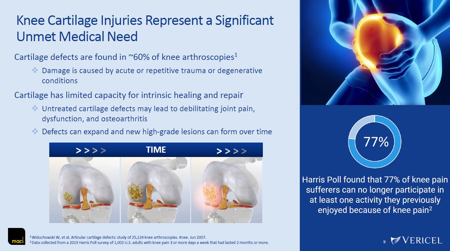 9  Knee Cartilage Injuries Represent a Significant Unmet Medical Need  Cartilage defects are found in ~60% of knee arthroscopies1  Damage is caused by acute or repetitive trauma or degenerative conditions  Cartilage has limited capacity for intrinsic healing and repair  Untreated cartilage defects may lead to debilitating joint pain, dysfunction, and osteoarthritis  Defects can expand and new high-grade lesions can form over time  > > > >  > > > >  TIME  1 Widuchowski W, et al. Articular cartilage defects: study of 25,124 knee arthroscopies. Knee. Jun 2007.  2 Data collected from a 2019 Harris Poll survey of 1,002 U.S. adults with knee pain 3 or more days a week that had lasted 2 months or more.  Harris Poll found that 77% of knee pain sufferers can no longer participate in at least one activity they previously enjoyed because of knee pain2