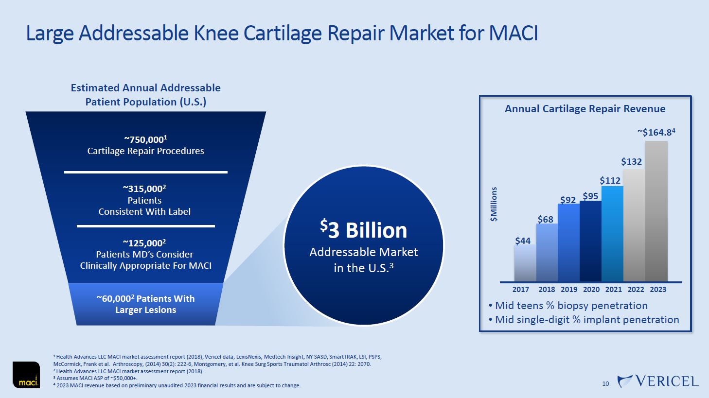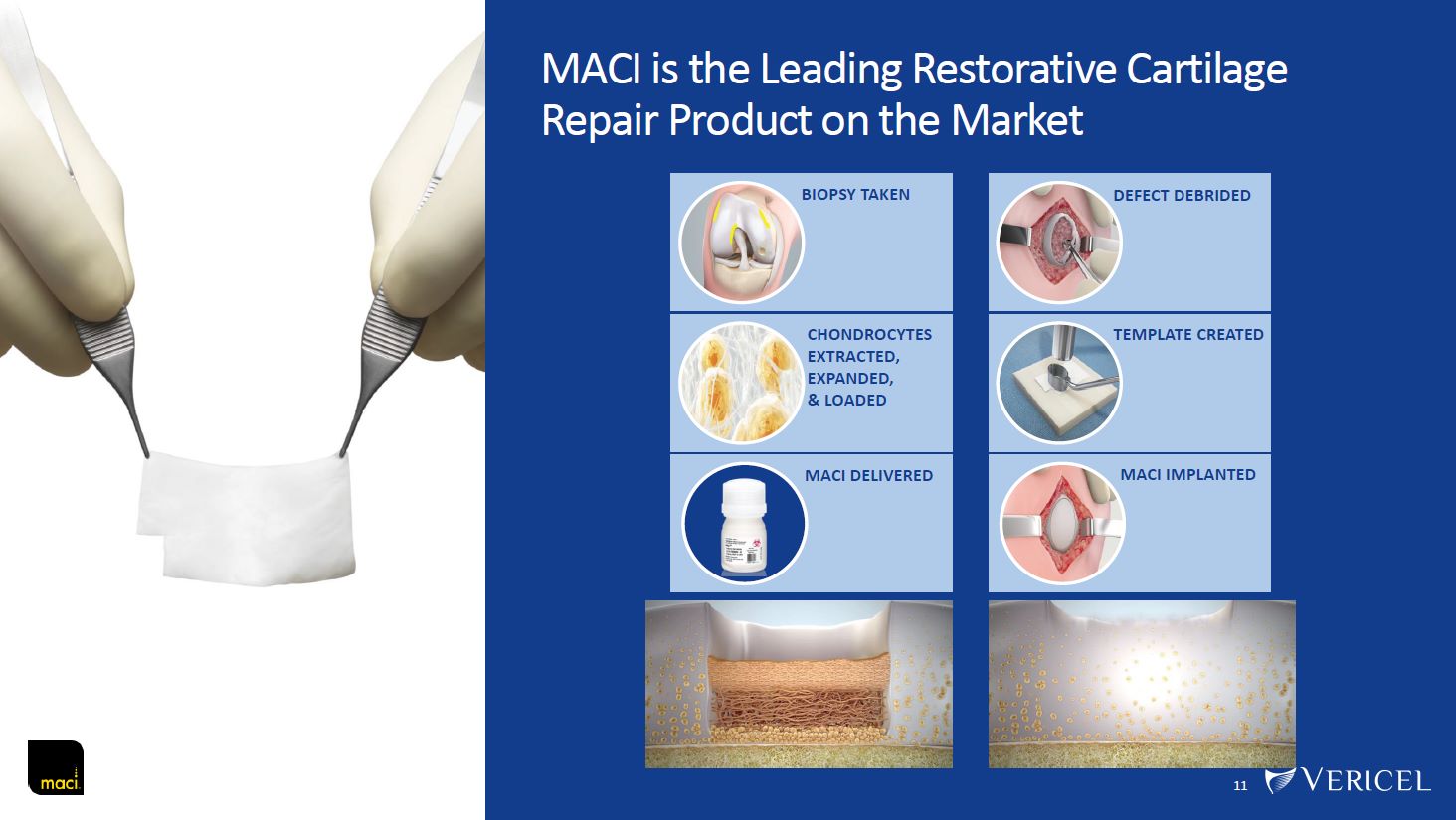 Large Addressable Knee Cartilage Repair Market for MACI  1 Health Advances LLC MACI market assessment report (2018), Vericel data, LexisNexis, Medtech Insight, NY SASD, SmartTRAK, LSI, PSPS, McCormick, Frank et al. Arthroscopy, (2014) 30(2): 222-6, Montgomery, et al. Knee Surg Sports Traumatol Arthrosc (2014) 22: 2070.  2 Health Advances LLC MACI market assessment report (2018).  3 Assumes MACI ASP of ~$50,000+.  4 2023 MACI revenue based on preliminary unaudited 2023 financial results and are subject to change.  10  Estimated Annual Addressable  Patient Population (U.S.)  ~315,0002  Patients  Consistent With Label  ~125,0002  Patients MD’s Consider  Clinically Appropriate For MACI  ~750,0001  Cartilage Repair Procedures  ~60,0002 Patients With Larger Lesions  $3 Billion Addressable Market in the U.S.3  $68  $44  $92  $95  $112  $132  Annual Cartilage Repair Revenue  ~$164.84  $Millions  2017 2018 2019 2020 2021 2022 2023  Mid teens % biopsy penetration  Mid single-digit % implant penetration
