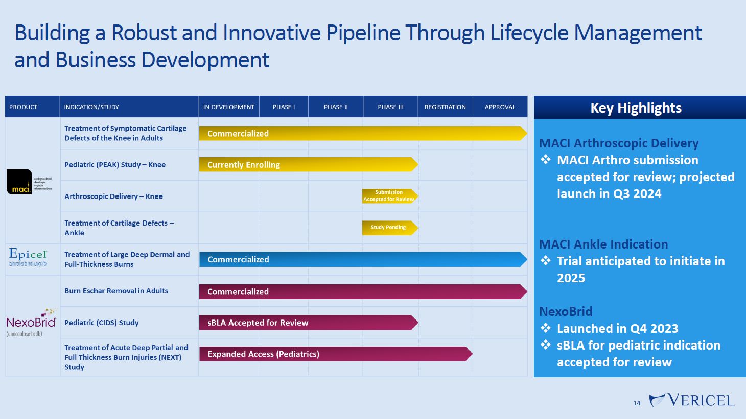 Surgeon Adoption Continues to be a Key MACI Growth Driver and Target Surgeons Will Increase With MACI Arthro Launch in 2024  13  2017-2019  Initial Launch  2020-2024  Expanded Open-Only Targets  2024+  Open and Arthro  # Surgeons  Taking Biopsies  3,000  Targets  5,000  Targets  7,000  Targets  ~50%  penetration  ~50%  penetration  Expect 50%+  penetration  Double-digit biopsy surgeon CAGR since launch  Arthroscopic option adds  ~2,000  additional surgeon targets  MACI Arthro  expected to be a key growth driver in 2024 and beyond