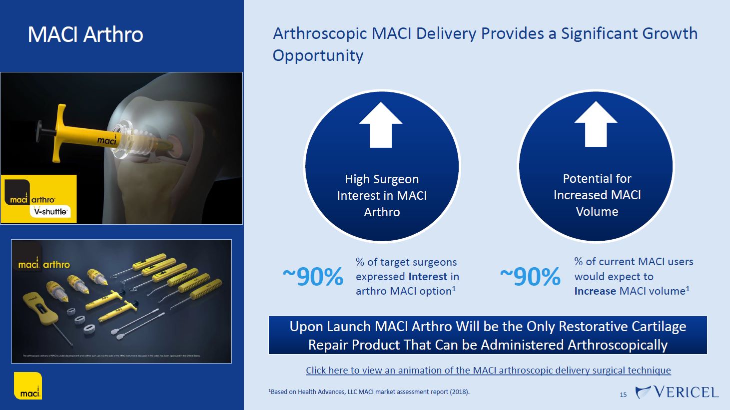 MACI Arthro  15  Arthroscopic MACI Delivery Provides a Significant Growth Opportunity  1Based on Health Advances, LLC MACI market assessment report (2018).  High Surgeon Interest in MACI Arthro  Potential for Increased MACI Volume  ~90%  % of target surgeons expressed Interest in arthro MACI option1  ~90%  % of current MACI users would expect to Increase MACI volume1  Upon Launch MACI Arthro Will be the Only Restorative Cartilage  Repair Product That Can be Administered Arthroscopically  Click here to view an animation of the MACI arthroscopic delivery surgical technique
