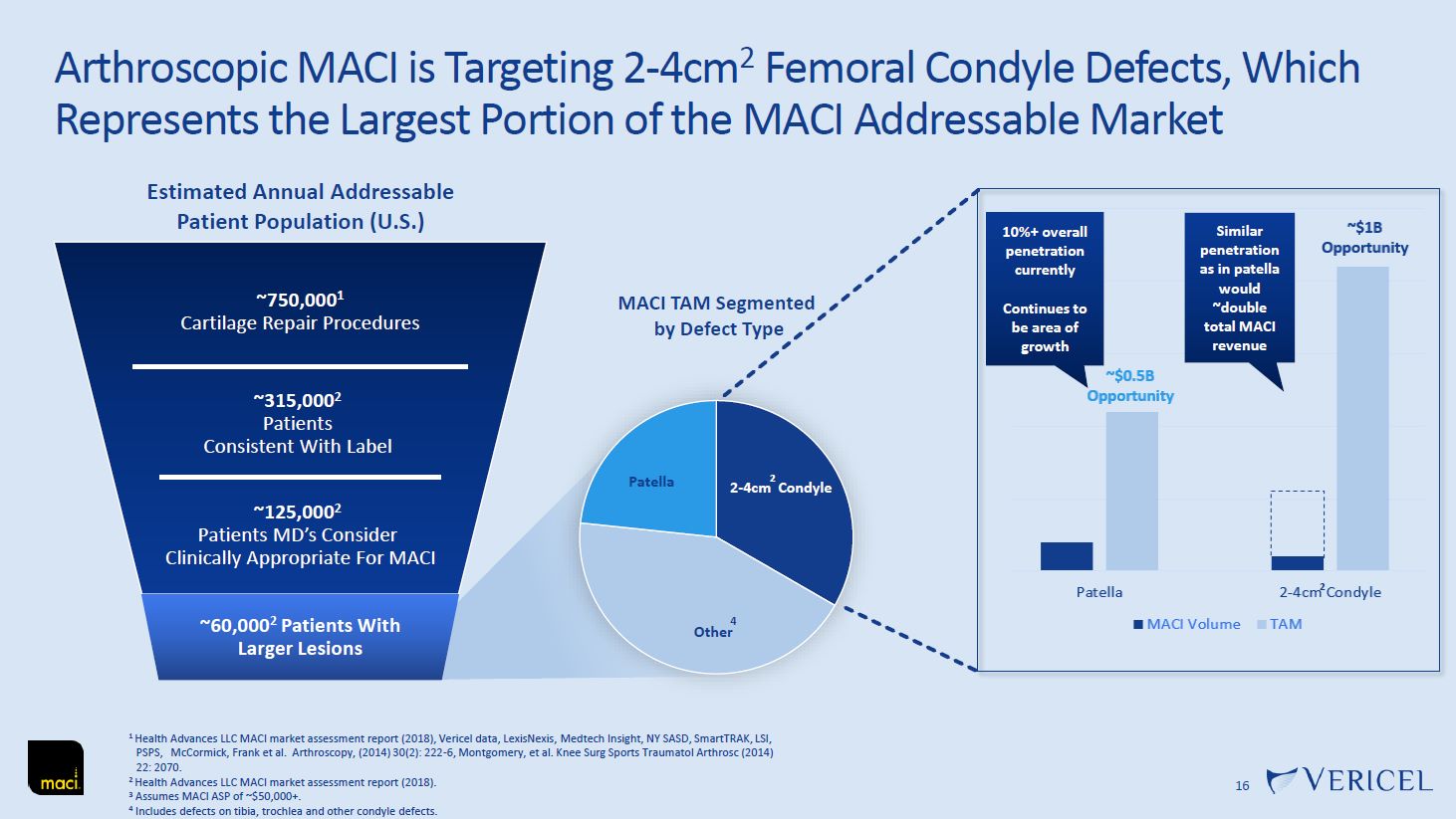 Arthroscopic MACI is Targeting 2-4cm2 Femoral Condyle Defects, Which Represents the Largest Portion of the MACI Addressable Market  16  MACI TAM Segmented  by Defect Type  1 Health Advances LLC MACI market assessment report (2018), Vericel data, LexisNexis, Medtech Insight, NY SASD, SmartTRAK, LSI, PSPS, McCormick, Frank et al. Arthroscopy, (2014) 30(2): 222-6, Montgomery, et al. Knee Surg Sports Traumatol Arthrosc (2014) 22: 2070.  2 Health Advances LLC MACI market assessment report (2018).  3 Assumes MACI ASP of ~$50,000+.  4 Includes defects on tibia, trochlea and other condyle defects.  Estimated Annual Addressable Patient Population (U.S.)  ~315,0002  Patients Consistent With Label  ~125,0002  Patients MD’s Consider  Clinically Appropriate For MACI  ~750,0001  Cartilage Repair Procedures  ~60,0002 Patients With Larger Lesions  2-4cm Condyle  Other  Patella  2  10%+ overall penetration currently  Continues to be area of growth  Similar penetration as in patella would  ~double total MACI revenue  4  2