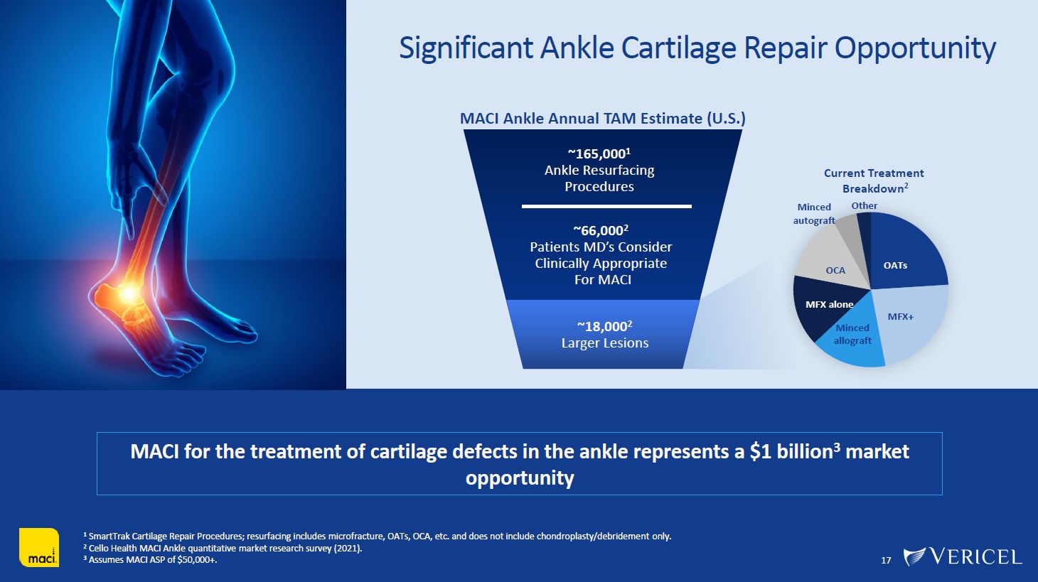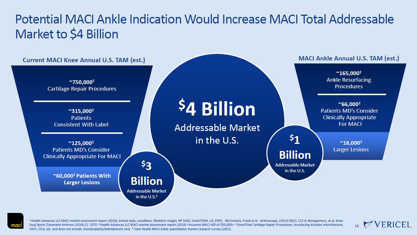 17  Significant Ankle Cartilage Repair Opportunity  OATs  MFX+  Minced allograft  MFX alone  OCA  Minced autograft  Other  MACI Ankle Annual TAM Estimate (U.S.)  ~66,0002  Patients MD’s Consider Clinically Appropriate For MACI  ~165,0001   Ankle Resurfacing Procedures  Current Treatment Breakdown2  MACI for the treatment of cartilage defects in the ankle represents a $1 billion3 market  opportunity  ~~1188,0,0000022  LLaarrggeerrLLeessioionnss  1 SmartTrak Cartilage Repair Procedures; resurfacing includes microfracture, OATs, OCA, etc. and does not include chondroplasty/debridement only.  2 Cello Health MACI Ankle quantitative market research survey (2021).  3 Assumes MACI ASP of $50,000+.